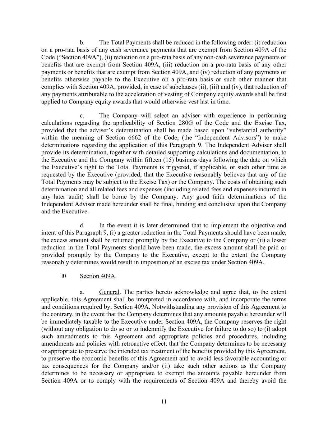 11 b. The Total Payments shall be reduced in the following order: (i) reduction on a pro-rata basis of any cash severance payments that are exempt from Section 409A of the Code (“Section 409A”), (ii) reduction on a pro-rata basis of any non-cash severance payments or benefits that are exempt from Section 409A, (iii) reduction on a pro-rata basis of any other payments or benefits that are exempt from Section 409A, and (iv) reduction of any payments or benefits otherwise payable to the Executive on a pro-rata basis or such other manner that complies with Section 409A; provided, in case of subclauses (ii), (iii) and (iv), that reduction of any payments attributable to the acceleration of vesting of Company equity awards shall be first applied to Company equity awards that would otherwise vest last in time. c. The Company will select an adviser with experience in performing calculations regarding the applicability of Section 280G of the Code and the Excise Tax, provided that the adviser’s determination shall be made based upon “substantial authority” within the meaning of Section 6662 of the Code, (the “Independent Advisors”) to make determinations regarding the application of this Paragraph 9. The Independent Adviser shall provide its determination, together with detailed supporting calculations and documentation, to the Executive and the Company within fifteen (15) business days following the date on which the Executive’s right to the Total Payments is triggered, if applicable, or such other time as requested by the Executive (provided, that the Executive reasonably believes that any of the Total Payments may be subject to the Excise Tax) or the Company. The costs of obtaining such determination and all related fees and expenses (including related fees and expenses incurred in any later audit) shall be borne by the Company. Any good faith determinations of the Independent Adviser made hereunder shall be final, binding and conclusive upon the Company and the Executive. d. In the event it is later determined that to implement the objective and intent of this Paragraph 9, (i) a greater reduction in the Total Payments should have been made, the excess amount shall be returned promptly by the Executive to the Company or (ii) a lesser reduction in the Total Payments should have been made, the excess amount shall be paid or provided promptly by the Company to the Executive, except to the extent the Company reasonably determines would result in imposition of an excise tax under Section 409A. 10. Section 409A. a. General. The parties hereto acknowledge and agree that, to the extent applicable, this Agreement shall be interpreted in accordance with, and incorporate the terms and conditions required by, Section 409A. Notwithstanding any provision of this Agreement to the contrary, in the event that the Company determines that any amounts payable hereunder will be immediately taxable to the Executive under Section 409A, the Company reserves the right (without any obligation to do so or to indemnify the Executive for failure to do so) to (i) adopt such amendments to this Agreement and appropriate policies and procedures, including amendments and policies with retroactive effect, that the Company determines to be necessary or appropriate to preserve the intended tax treatment of the benefits provided by this Agreement, to preserve the economic benefits of this Agreement and to avoid less favorable accounting or tax consequences for the Company and/or (ii) take such other actions as the Company determines to be necessary or appropriate to exempt the amounts payable hereunder from Section 409A or to comply with the requirements of Section 409A and thereby avoid the
