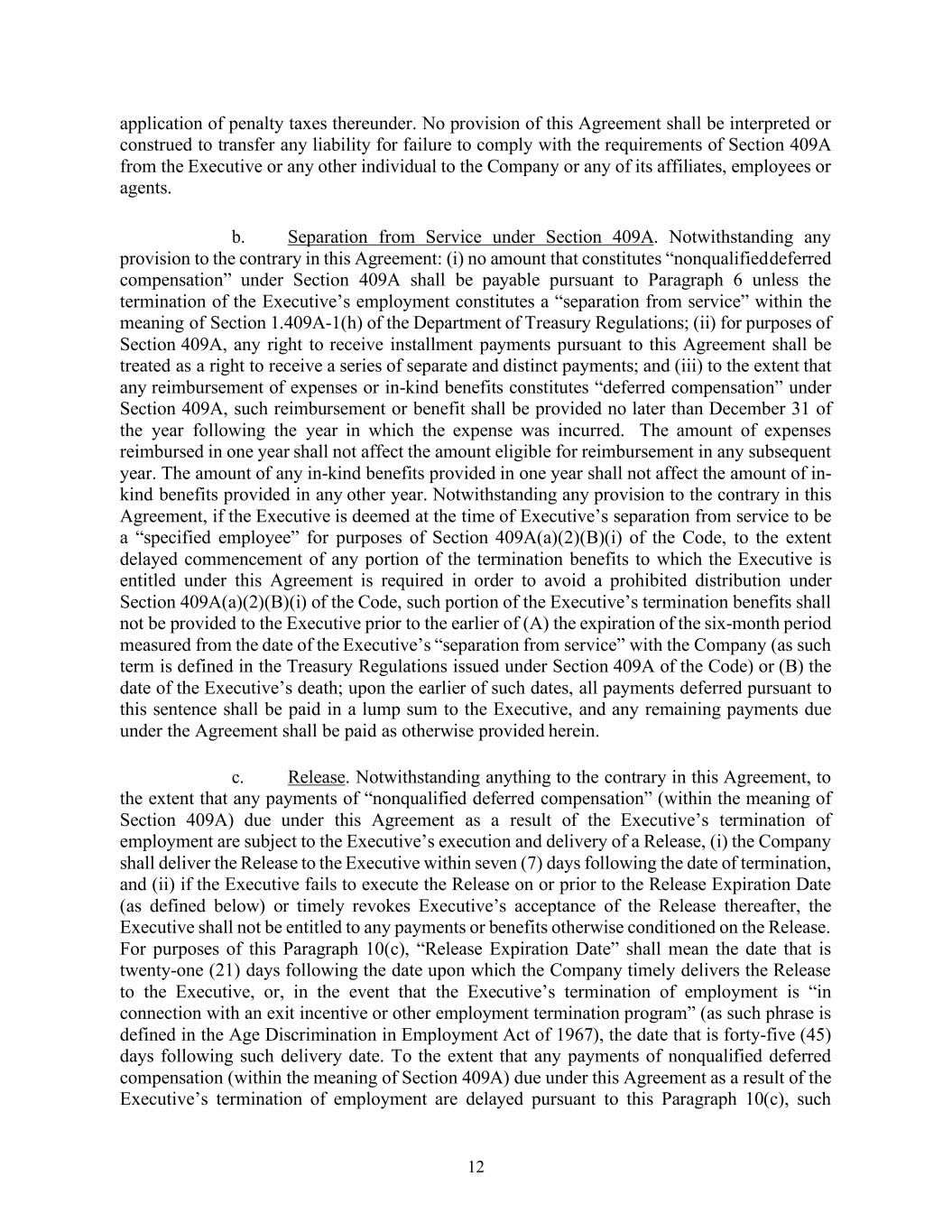 12 application of penalty taxes thereunder. No provision of this Agreement shall be interpreted or construed to transfer any liability for failure to comply with the requirements of Section 409A from the Executive or any other individual to the Company or any of its affiliates, employees or agents. b. Separation from Service under Section 409A. Notwithstanding any provision to the contrary in this Agreement: (i) no amount that constitutes “nonqualified deferred compensation” under Section 409A shall be payable pursuant to Paragraph 6 unless the termination of the Executive’s employment constitutes a “separation from service” within the meaning of Section 1.409A-1(h) of the Department of Treasury Regulations; (ii) for purposes of Section 409A, any right to receive installment payments pursuant to this Agreement shall be treated as a right to receive a series of separate and distinct payments; and (iii) to the extent that any reimbursement of expenses or in-kind benefits constitutes “deferred compensation” under Section 409A, such reimbursement or benefit shall be provided no later than December 31 of the year following the year in which the expense was incurred. The amount of expenses reimbursed in one year shall not affect the amount eligible for reimbursement in any subsequent year. The amount of any in-kind benefits provided in one year shall not affect the amount of in- kind benefits provided in any other year. Notwithstanding any provision to the contrary in this Agreement, if the Executive is deemed at the time of Executive’s separation from service to be a “specified employee” for purposes of Section 409A(a)(2)(B)(i) of the Code, to the extent delayed commencement of any portion of the termination benefits to which the Executive is entitled under this Agreement is required in order to avoid a prohibited distribution under Section 409A(a)(2)(B)(i) of the Code, such portion of the Executive’s termination benefits shall not be provided to the Executive prior to the earlier of (A) the expiration of the six-month period measured from the date of the Executive’s “separation from service” with the Company (as such term is defined in the Treasury Regulations issued under Section 409A of the Code) or (B) the date of the Executive’s death; upon the earlier of such dates, all payments deferred pursuant to this sentence shall be paid in a lump sum to the Executive, and any remaining payments due under the Agreement shall be paid as otherwise provided herein. c. Release. Notwithstanding anything to the contrary in this Agreement, to the extent that any payments of “nonqualified deferred compensation” (within the meaning of Section 409A) due under this Agreement as a result of the Executive’s termination of employment are subject to the Executive’s execution and delivery of a Release, (i) the Company shall deliver the Release to the Executive within seven (7) days following the date of termination, and (ii) if the Executive fails to execute the Release on or prior to the Release Expiration Date (as defined below) or timely revokes Executive’s acceptance of the Release thereafter, the Executive shall not be entitled to any payments or benefits otherwise conditioned on the Release. For purposes of this Paragraph 10(c), “Release Expiration Date” shall mean the date that is twenty-one (21) days following the date upon which the Company timely delivers the Release to the Executive, or, in the event that the Executive’s termination of employment is “in connection with an exit incentive or other employment termination program” (as such phrase is defined in the Age Discrimination in Employment Act of 1967), the date that is forty-five (45) days following such delivery date. To the extent that any payments of nonqualified deferred compensation (within the meaning of Section 409A) due under this Agreement as a result of the Executive’s termination of employment are delayed pursuant to this Paragraph 10(c), such