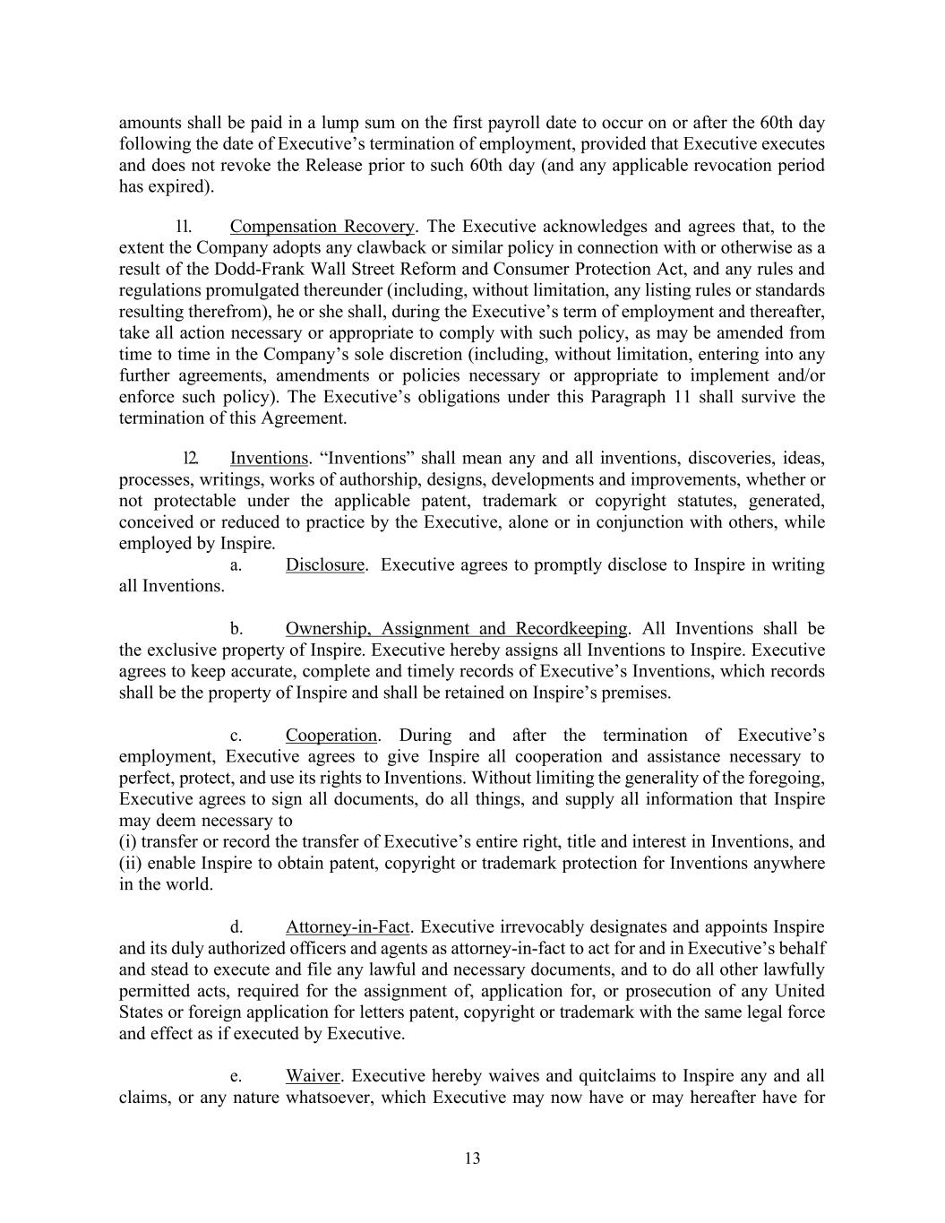 13 amounts shall be paid in a lump sum on the first payroll date to occur on or after the 60th day following the date of Executive’s termination of employment, provided that Executive executes and does not revoke the Release prior to such 60th day (and any applicable revocation period has expired). 11. Compensation Recovery. The Executive acknowledges and agrees that, to the extent the Company adopts any clawback or similar policy in connection with or otherwise as a result of the Dodd-Frank Wall Street Reform and Consumer Protection Act, and any rules and regulations promulgated thereunder (including, without limitation, any listing rules or standards resulting therefrom), he or she shall, during the Executive’s term of employment and thereafter, take all action necessary or appropriate to comply with such policy, as may be amended from time to time in the Company’s sole discretion (including, without limitation, entering into any further agreements, amendments or policies necessary or appropriate to implement and/or enforce such policy). The Executive’s obligations under this Paragraph 11 shall survive the termination of this Agreement. 12. Inventions. “Inventions” shall mean any and all inventions, discoveries, ideas, processes, writings, works of authorship, designs, developments and improvements, whether or not protectable under the applicable patent, trademark or copyright statutes, generated, conceived or reduced to practice by the Executive, alone or in conjunction with others, while employed by Inspire. a. Disclosure. Executive agrees to promptly disclose to Inspire in writing all Inventions. b. Ownership, Assignment and Recordkeeping. All Inventions shall be the exclusive property of Inspire. Executive hereby assigns all Inventions to Inspire. Executive agrees to keep accurate, complete and timely records of Executive’s Inventions, which records shall be the property of Inspire and shall be retained on Inspire’s premises. c. Cooperation. During and after the termination of Executive’s employment, Executive agrees to give Inspire all cooperation and assistance necessary to perfect, protect, and use its rights to Inventions. Without limiting the generality of the foregoing, Executive agrees to sign all documents, do all things, and supply all information that Inspire may deem necessary to (i) transfer or record the transfer of Executive’s entire right, title and interest in Inventions, and (ii) enable Inspire to obtain patent, copyright or trademark protection for Inventions anywhere in the world. d. Attorney-in-Fact. Executive irrevocably designates and appoints Inspire and its duly authorized officers and agents as attorney-in-fact to act for and in Executive’s behalf and stead to execute and file any lawful and necessary documents, and to do all other lawfully permitted acts, required for the assignment of, application for, or prosecution of any United States or foreign application for letters patent, copyright or trademark with the same legal force and effect as if executed by Executive. e. Waiver. Executive hereby waives and quitclaims to Inspire any and all claims, or any nature whatsoever, which Executive may now have or may hereafter have for