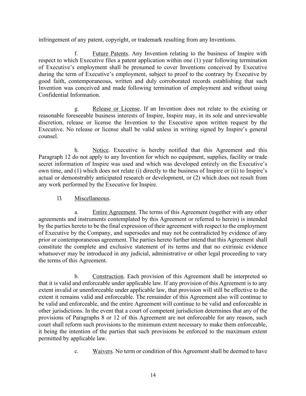 14 infringement of any patent, copyright, or trademark resulting from any Inventions. f. Future Patents. Any Invention relating to the business of Inspire with respect to which Executive files a patent application within one (1) year following termination of Executive’s employment shall be presumed to cover Inventions conceived by Executive during the term of Executive’s employment, subject to proof to the contrary by Executive by good faith, contemporaneous, written and duly corroborated records establishing that such Invention was conceived and made following termination of employment and without using Confidential Information. g. Release or License. If an Invention does not relate to the existing or reasonable foreseeable business interests of Inspire, Inspire may, in its sole and unreviewable discretion, release or license the Invention to the Executive upon written request by the Executive. No release or license shall be valid unless in writing signed by Inspire’s general counsel. h. Notice. Executive is hereby notified that this Agreement and this Paragraph 12 do not apply to any Invention for which no equipment, supplies, facility or trade secret information of Inspire was used and which was developed entirely on the Executive’s own time, and (1) which does not relate (i) directly to the business of Inspire or (ii) to Inspire’s actual or demonstrably anticipated research or development, or (2) which does not result from any work performed by the Executive for Inspire. 13. Miscellaneous. a. Entire Agreement. The terms of this Agreement (together with any other agreements and instruments contemplated by this Agreement or referred to herein) is intended by the parties hereto to be the final expression of their agreement with respect to the employment of Executive by the Company, and supersedes and may not be contradicted by evidence of any prior or contemporaneous agreement. The parties hereto further intend that this Agreement shall constitute the complete and exclusive statement of its terms and that no extrinsic evidence whatsoever may be introduced in any judicial, administrative or other legal proceeding to vary the terms of this Agreement. b. Construction. Each provision of this Agreement shall be interpreted so that it is valid and enforceable under applicable law. If any provision of this Agreement is to any extent invalid or unenforceable under applicable law, that provision will still be effective to the extent it remains valid and enforceable. The remainder of this Agreement also will continue to be valid and enforceable, and the entire Agreement will continue to be valid and enforceable in other jurisdictions. In the event that a court of competent jurisdiction determines that any of the provisions of Paragraphs 8 or 12 of this Agreement are not enforceable for any reason, such court shall reform such provisions to the minimum extent necessary to make them enforceable, it being the intention of the parties that such provisions be enforced to the maximum extent permitted by applicable law. c. Waivers. No term or condition of this Agreement shall be deemed to have