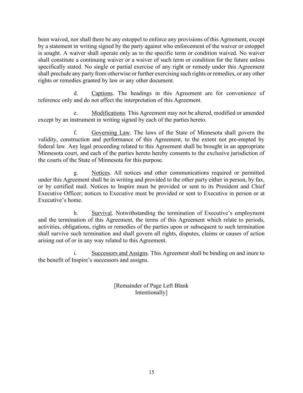 15 been waived, nor shall there be any estoppel to enforce any provisions of this Agreement, except by a statement in writing signed by the party against who enforcement of the waiver or estoppel is sought. A waiver shall operate only as to the specific term or condition waived. No waiver shall constitute a continuing waiver or a waiver of such term or condition for the future unless specifically stated. No single or partial exercise of any right or remedy under this Agreement shall preclude any party from otherwise or further exercising such rights or remedies, or any other rights or remedies granted by law or any other document. d. Captions. The headings in this Agreement are for convenience of reference only and do not affect the interpretation of this Agreement. e. Modifications. This Agreement may not be altered, modified or amended except by an instrument in writing signed by each of the parties hereto. f. Governing Law. The laws of the State of Minnesota shall govern the validity, construction and performance of this Agreement, to the extent not pre-empted by federal law. Any legal proceeding related to this Agreement shall be brought in an appropriate Minnesota court, and each of the parties hereto hereby consents to the exclusive jurisdiction of the courts of the State of Minnesota for this purpose. g. Notices. All notices and other communications required or permitted under this Agreement shall be in writing and provided to the other party either in person, by fax, or by certified mail. Notices to Inspire must be provided or sent to its President and Chief Executive Officer; notices to Executive must be provided or sent to Executive in person or at Executive’s home. h. Survival. Notwithstanding the termination of Executive’s employment and the termination of this Agreement, the terms of this Agreement which relate to periods, activities, obligations, rights or remedies of the parties upon or subsequent to such termination shall survive such termination and shall govern all rights, disputes, claims or causes of action arising out of or in any way related to this Agreement. i. Successors and Assigns. This Agreement shall be binding on and inure to the benefit of Inspire’s successors and assigns. [Remainder of Page Left Blank Intentionally]