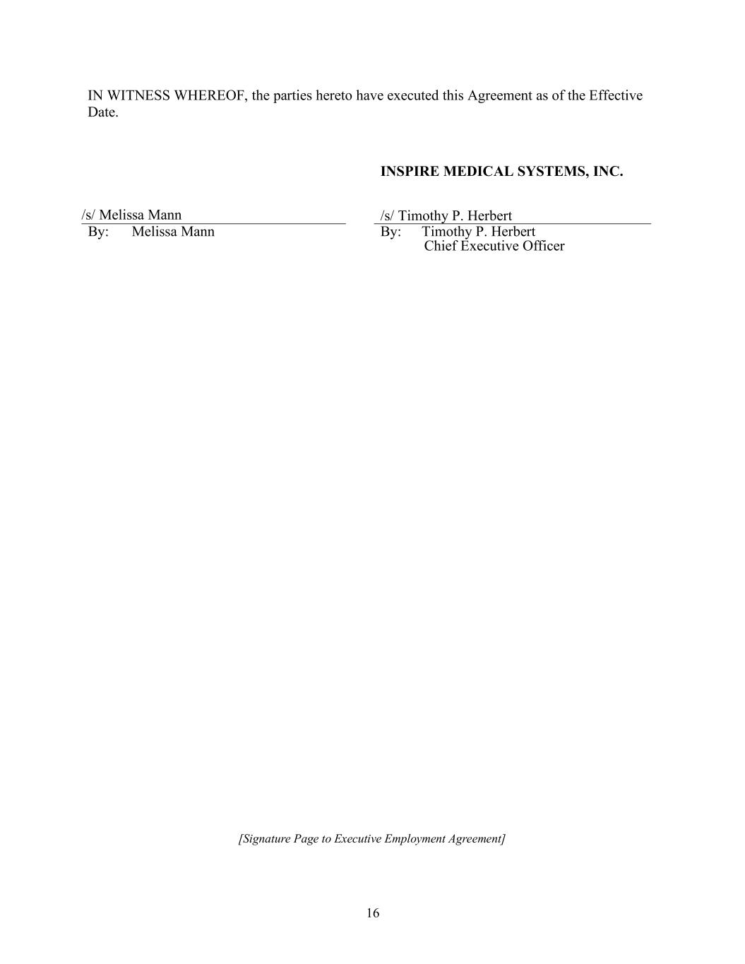 16 IN WITNESS WHEREOF, the parties hereto have executed this Agreement as of the Effective Date. [Signature Page to Executive Employment Agreement] /s/ Melissa Mann INSPIRE MEDICAL SYSTEMS, INC. /s/ Timothy P. Herbert By: Melissa Mann By: Timothy P. Herbert Chief Executive Officer