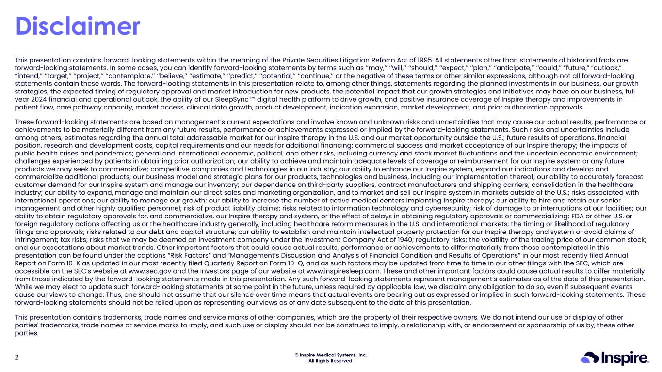 © Inspire Medical Systems, Inc. All Rights Reserved. Disclaimer 2 This presentation contains forward-looking statements within the meaning of the Private Securities Litigation Reform Act of 1995. All statements other than statements of historical facts are forward-looking statements. In some cases, you can identify forward-looking statements by terms such as ‘‘may,’’ ‘‘will,’’ ‘‘should,’’ ‘‘expect,’’ ‘‘plan,’’ ‘‘anticipate,’’ ‘‘could,’’ “future,” “outlook,” ‘‘intend,’’ ‘‘target,’’ ‘‘project,’’ ‘‘contemplate,’’ ‘‘believe,’’ ‘‘estimate,’’ ‘‘predict,’’ ‘‘potential,’’ ‘‘continue,’’ or the negative of these terms or other similar expressions, although not all forward-looking statements contain these words. The forward-looking statements in this presentation relate to, among other things, statements regarding the planned investments in our business, our growth strategies, the expected timing of regulatory approval and market introduction for new products, the potential impact that our growth strategies and initiatives may have on our business, full year 2024 financial and operational outlook, the ability of our SleepSync digital health platform to drive growth, and positive insurance coverage of Inspire therapy and improvements in patient flow, care pathway capacity, market access, clinical data growth, product development, indication expansion, market development, and prior authorization approvals. These forward-looking statements are based on management’s current expectations and involve known and unknown risks and uncertainties that may cause our actual results, performance or achievements to be materially different from any future results, performance or achievements expressed or implied by the forward-looking statements. Such risks and uncertainties include, among others, estimates regarding the annual total addressable market for our Inspire therapy in the U.S. and our market opportunity outside the U.S.; future results of operations, financial position, research and development costs, capital requirements and our needs for additional financing; commercial success and market acceptance of our Inspire therapy; the impacts of public health crises and pandemics; general and international economic, political, and other risks, including currency and stock market fluctuations and the uncertain economic environment; challenges experienced by patients in obtaining prior authorization; our ability to achieve and maintain adequate levels of coverage or reimbursement for our Inspire system or any future products we may seek to commercialize; competitive companies and technologies in our industry; our ability to enhance our Inspire system, expand our indications and develop and commercialize additional products; our business model and strategic plans for our products, technologies and business, including our implementation thereof; our ability to accurately forecast customer demand for our Inspire system and manage our inventory; our dependence on third-party suppliers, contract manufacturers and shipping carriers; consolidation in the healthcare industry; our ability to expand, manage and maintain our direct sales and marketing organization, and to market and sell our Inspire system in markets outside of the U.S.; risks associated with international operations; our ability to manage our growth; our ability to increase the number of active medical centers implanting Inspire therapy; our ability to hire and retain our senior management and other highly qualified personnel; risk of product liability claims; risks related to information technology and cybersecurity; risk of damage to or interruptions at our facilities; our ability to obtain regulatory approvals for, and commercialize, our Inspire therapy and system, or the effect of delays in obtaining regulatory approvals or commercializing; FDA or other U.S. or foreign regulatory actions affecting us or the healthcare industry generally, including healthcare reform measures in the U.S. and international markets; the timing or likelihood of regulatory filings and approvals; risks related to our debt and capital structure; our ability to establish and maintain intellectual property protection for our Inspire therapy and system or avoid claims of infringement; tax risks; risks that we may be deemed an investment company under the Investment Company Act of 1940; regulatory risks; the volatility of the trading price of our common stock; and our expectations about market trends. Other important factors that could cause actual results, performance or achievements to differ materially from those contemplated in this presentation can be found under the captions “Risk Factors” and “Management’s Discussion and Analysis of Financial Condition and Results of Operations” in our most recently filed Annual Report on Form 10-K as updated in our most recently filed Quarterly Report on Form 10-Q, and as such factors may be updated from time to time in our other filings with the SEC, which are accessible on the SEC’s website at www.sec.gov and the Investors page of our website at www.inspiresleep.com. These and other important factors could cause actual results to differ materially from those indicated by the forward-looking statements made in this presentation. Any such forward-looking statements represent management’s estimates as of the date of this presentation. While we may elect to update such forward-looking statements at some point in the future, unless required by applicable law, we disclaim any obligation to do so, even if subsequent events cause our views to change. Thus, one should not assume that our silence over time means that actual events are bearing out as expressed or implied in such forward-looking statements. These forward-looking statements should not be relied upon as representing our views as of 