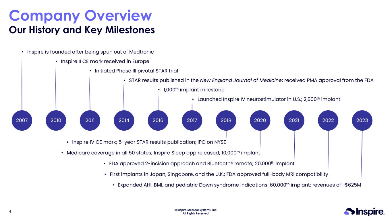 © Inspire Medical Systems, Inc. All Rights Reserved. Company Overview The first and only… 3 >280 PUBLICATIONS Compelling body of evidence >260 MILLION U.S. COVERED LIVES Established reimbursement in all 50 states >1,100 EMPLOYEES Led by a proven management team >$625 MILLION REVENUE IN 2023 With 40% year-over-year growth >75,000 PATIENTS TREATED Significant first-mover advantage >$10 BILLION Underpenetrated U.S. market Innovative, closed-loop, neurostimulation technology for Obstructive Sleep Apnea (OSA)