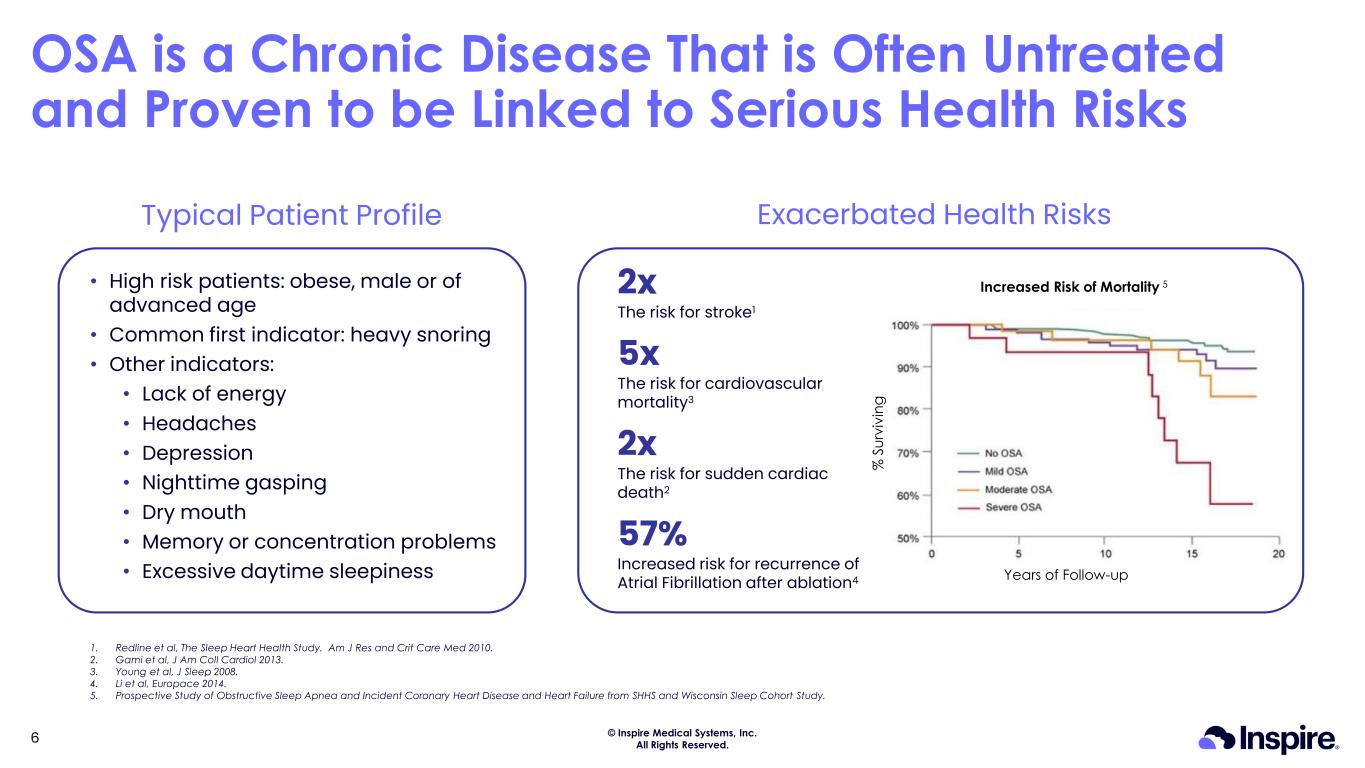 © Inspire Medical Systems, Inc. All Rights Reserved. Obstructive Sleep Apnea is Caused by Blockage that Prevents Airflow to the Lungs 5 Airway obstruction during breathing Typical OSA event • Results in repeated arousals and oxygen desaturations • Severity of sleep apnea is measured by frequency of apnea or hypopnea events per hour, which is referred to as the Apnea-Hypopnea Index (AHI) Normal Mild Moderate Severe 5 15 30 Apnea-Hypopnea Index
