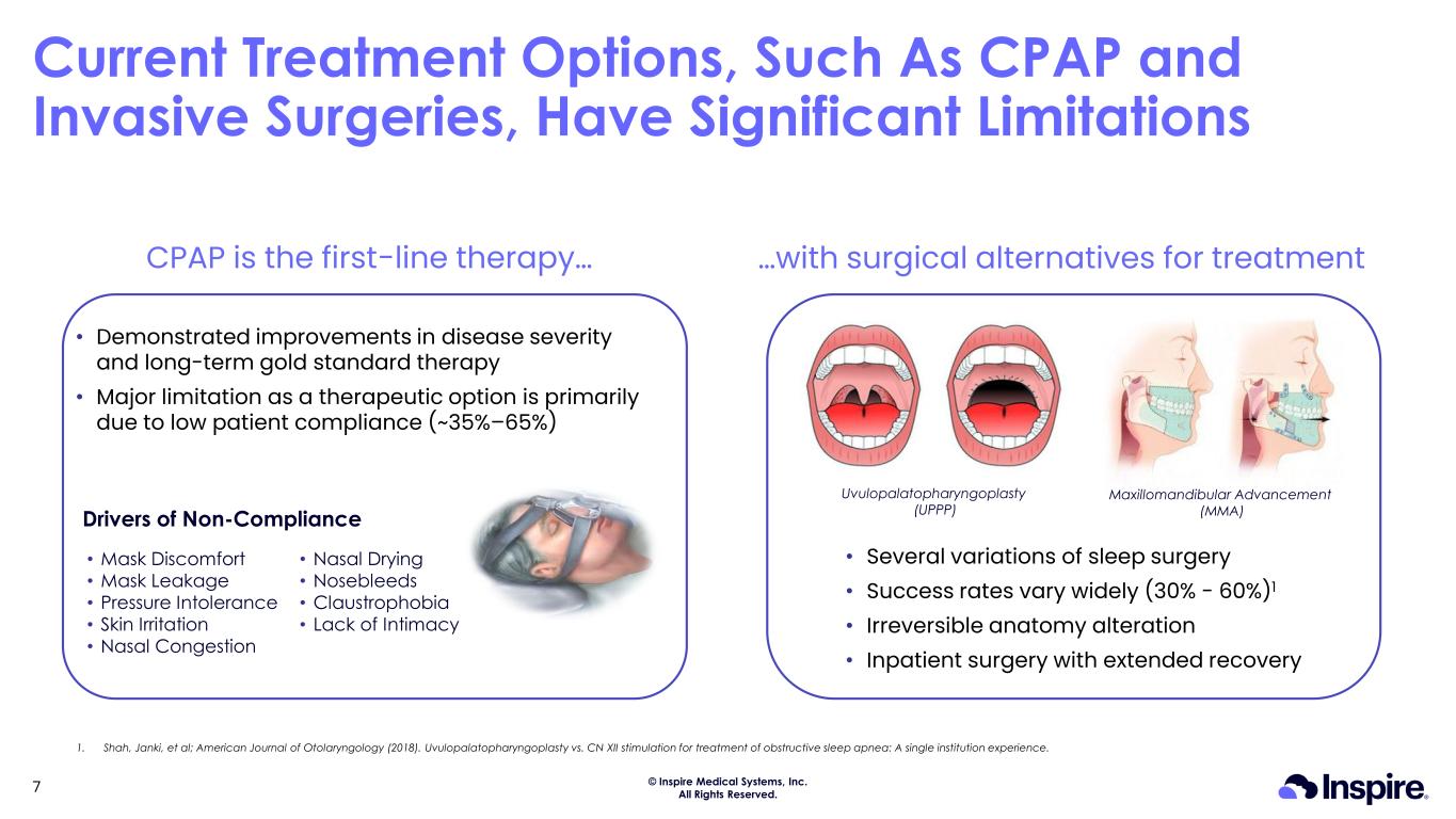 © Inspire Medical Systems, Inc. All Rights Reserved. OSA is a Chronic Disease That is Often Untreated and Proven to be Linked to Serious Health Risks 6 Exacerbated Health Risks • High risk patients: obese, male or of advanced age • Common first indicator: heavy snoring • Other indicators: • Lack of energy • Headaches • Depression • Nighttime gasping • Dry mouth • Memory or concentration problems • Excessive daytime sleepiness 1. Redline et al, The Sleep Heart Health Study. Am J Res and Crit Care Med 2010. 2. Gami et al, J Am Coll Cardiol 2013. 3. Young et al, J Sleep 2008. 4. Li et al, Europace 2014. 5. Prospective Study of Obstructive Sleep Apnea and Incident Coronary Heart Disease and Heart Failure from SHHS and Wisconsin Sleep Cohort Study. 2x The risk for stroke1 2x The risk for sudden cardiac death2 57% Increased risk for recurrence of Atrial Fibrillation after ablation4 5x The risk for cardiovascular mortality3 Years of Follow-up % S ur vi vi ng Increased Risk of Mortality 5 Typical Patient Profile