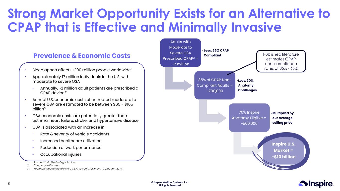 © Inspire Medical Systems, Inc. All Rights Reserved. Current Treatment Options, Such As CPAP and Invasive Surgeries, Have Significant Limitations 7 InaUvulopalatopharyngoplasty (UPPP) Maxillomandibular Advancement (MMA) • Several variations of sleep surgery • Success rates vary widely (30% - 60%)1 • Irreversible anatomy alteration • Inpatient surgery with extended recovery …with surgical alternatives for treatmentCPAP is the first-line therapy… 1. Shah, Janki, et al; American Journal of Otolaryngology (2018). Uvulopalatopharyngoplasty vs. CN XII stimulation for treatment of obstructive sleep apnea: A single institution experience. Drivers of Non-Compliance • Demonstrated improvements in disease severity and long-term gold standard therapy • Major limitation as a therapeutic option is primarily due to low patient compliance (~35%–65%) • Mask Discomfort • Mask Leakage • Pressure Intolerance • Skin Irritation • Nasal Congestion • Nasal Drying • Nosebleeds • Claustrophobia • Lack of Intimacy