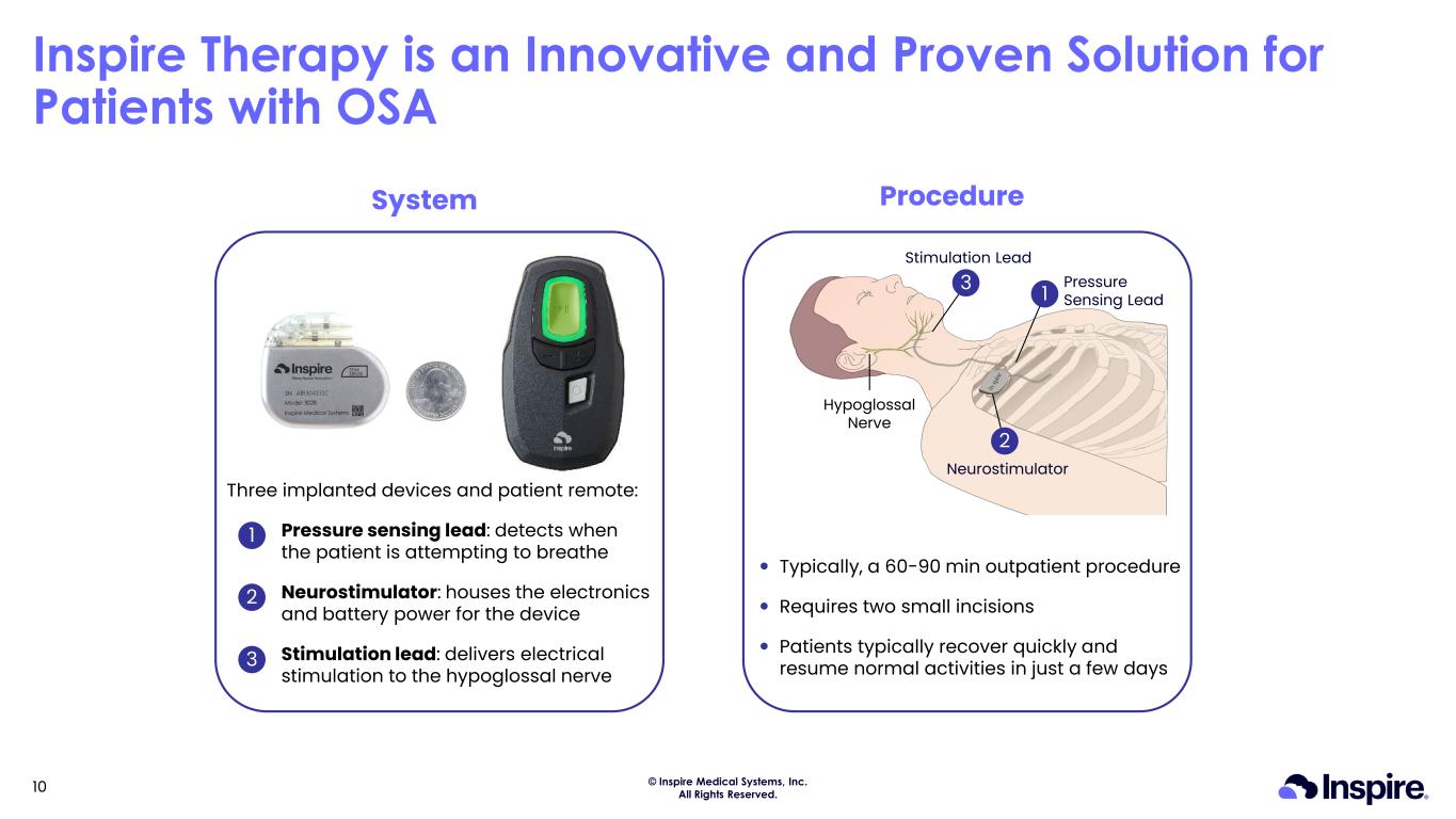 © Inspire Medical Systems, Inc. All Rights Reserved. Compared to CPAP, Inspire has been Demonstrated to be Better at Improving OSA Symptoms, Potentially with Greater Therapy Adherence 9 Therapy Adherence1 4.0 5.0Usage/Night (hours) 1. Heiser, Sleep & Breathing 2022 Comparison between baseline and 12-month follow-up between matched cohorts 2. Epsworth Sleepiness Scale Sleepiness Reduction1 3.9 8.0ESS reduction (points) 2 p = 0.042 p = 0.087 CPAP CPAP UAS (Inspire) UAS (Inspire)