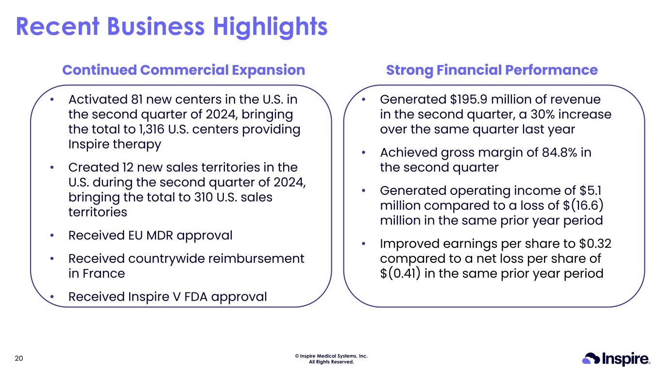 •Activated 81 new U.S. centers in the second quarter of 2024, bringing the total to 1,316 U.S. medical centers providing Inspire therapy