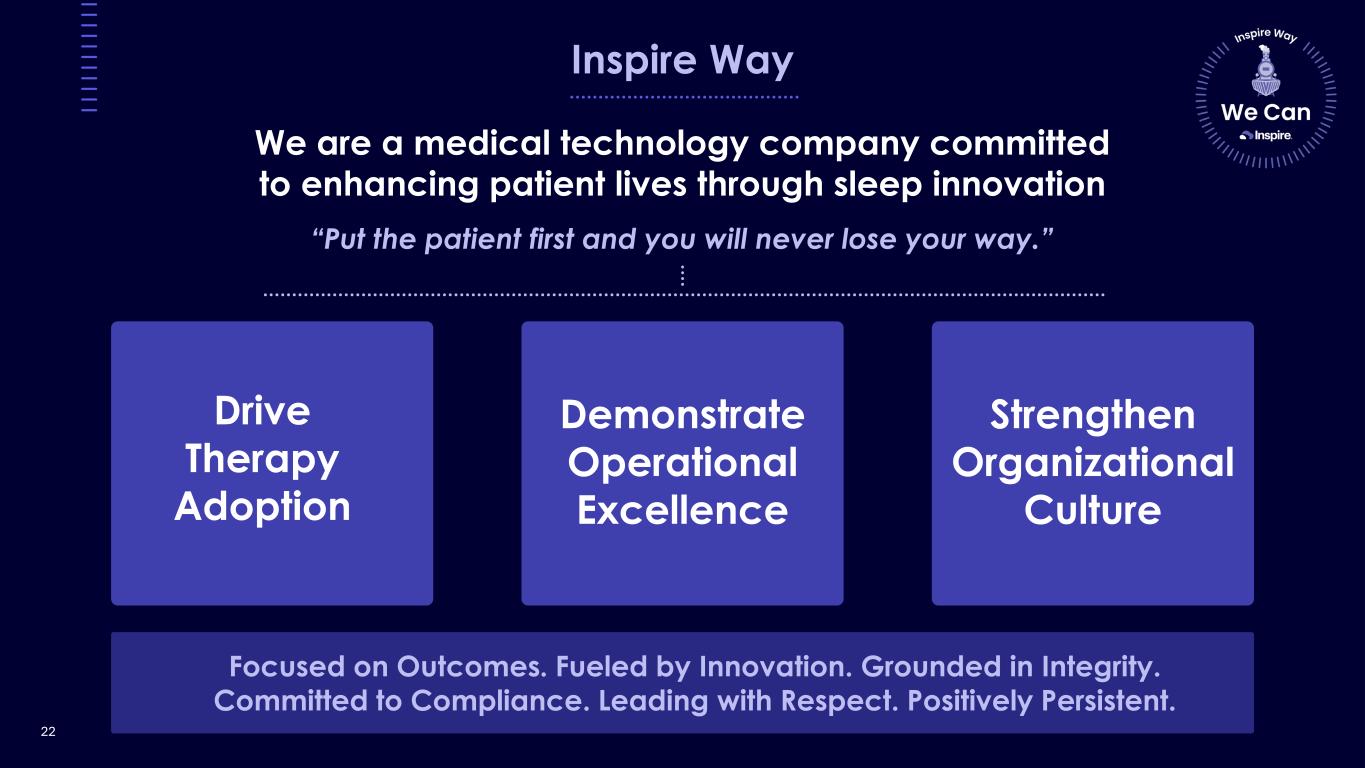 Inspire Way We are a medical technology company committed to enhancing patient lives through sleep innovation “Put the patient first and you will never lose your way.” Demonstrate Operational Excellence Drive Therapy Adoption Strengthen Organizational Culture Focused on Outcomes. Fueled by Innovation. Grounded in Integrity. Committed to Compliance. Leading with Respect. Positively Persistent. 22