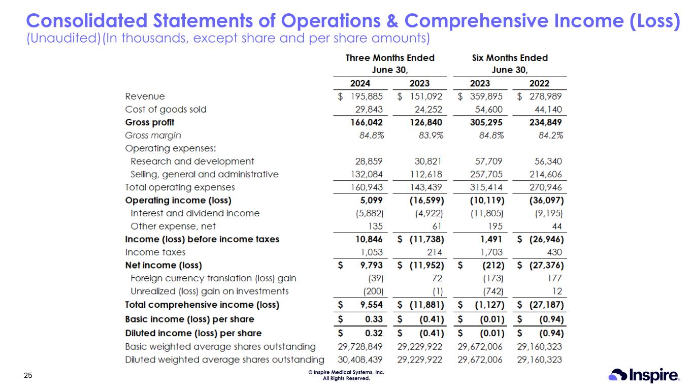 Inspire is increasing diluted net income per share guidance for the full year 2024 to between $0.60 to $0.80 per share, excluding the impact of any share repurchases that may be effected during the year. This compares to the prior guidance of $0.10 to $0.20 per share.