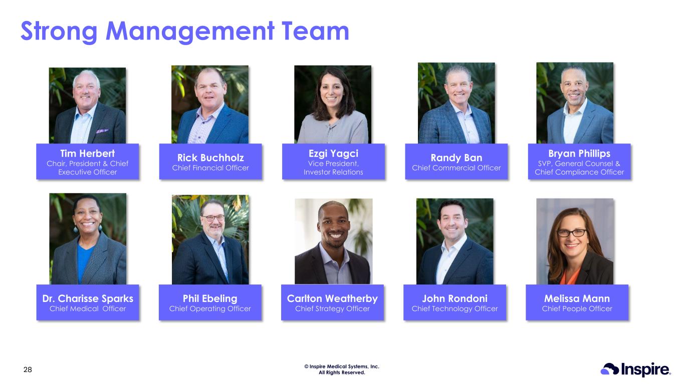 © Inspire Medical Systems, Inc. All Rights Reserved. Randy Ban Chief Commercial Officer Bryan Phillips SVP, General Counsel & Chief Compliance Officer Tim Herbert Chair, President & Chief Executive Officer Strong Management Team Ezgi Yagci Vice President, Investor Relations Rick Buchholz Chief Financial Officer John Rondoni Chief Technology Officer Phil Ebeling Chief Operating Officer Carlton Weatherby Chief Strategy Officer Dr. Charisse Sparks Chief Medical Officer 28 Melissa Mann Chief People Officer