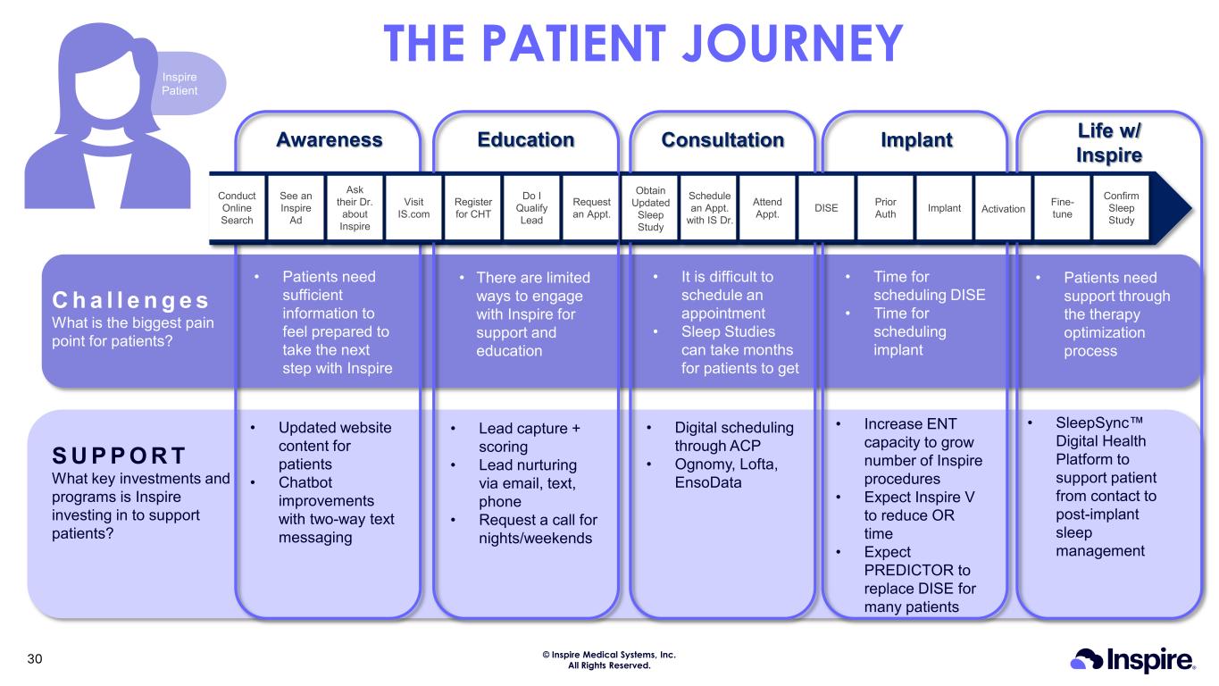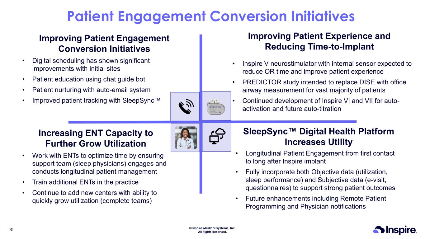 © Inspire Medical Systems, Inc. All Rights Reserved. Inspire Patient THE PATIENT JOURNEY Awareness Education Consultation Implant Life w/ Inspire Confirm Sleep Study Fine- tuneActivationImplantPrior AuthDISE Conduct Online Search Attend Appt. Schedule an Appt. with IS Dr. Obtain Updated Sleep Study Request an Appt. Do I Qualify Lead Register for CHT Visit IS.com Ask their Dr. about Inspire See an Inspire Ad C h a l l e n g e s What is the biggest pain point for patients? S U P P O R T What key investments and programs is Inspire investing in to support patients? • Patients need sufficient information to feel prepared to take the next step with Inspire • There are limited ways to engage with Inspire for support and education • It is difficult to schedule an appointment • Sleep Studies can take months for patients to get • Time for scheduling DISE • Time for scheduling implant • Patients need support through the therapy optimization process • Lead capture + scoring • Lead nurturing via email, text, phone • Request a call for nights/weekends • Updated website content for patients • Chatbot improvements with two-way text messaging • Digital scheduling through ACP • Ognomy, Lofta, EnsoData • Increase ENT capacity to grow number of Inspire procedures • Expect Inspire V to reduce OR time • Expect PREDICTOR to replace DISE for many patients • SleepSync Digital Health Platform to support patient from contact to post-implant sleep management 30