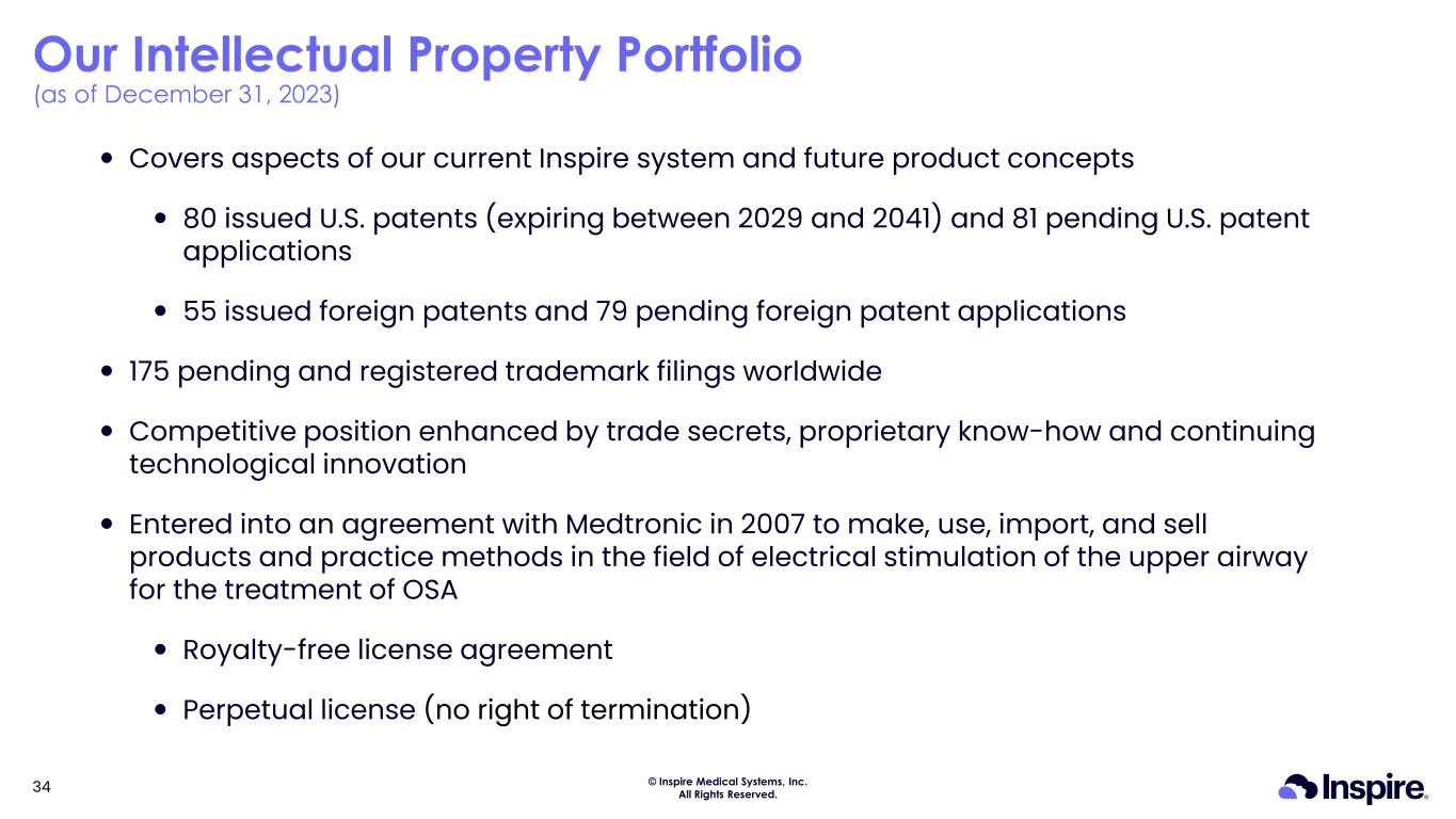 © Inspire Medical Systems, Inc. All Rights Reserved. Our Intellectual Property Portfolio (as of December 31, 2023) Covers aspects of our current Inspire system and future product concepts 80 issued U.S. patents (expiring between 2029 and 2041) and 81 pending U.S. patent applications 55 issued foreign patents and 79 pending foreign patent applications 175 pending and registered trademark filings worldwide Competitive position enhanced by trade secrets, proprietary know-how and continuing technological innovation Entered into an agreement with Medtronic in 2007 to make, use, import, and sell products and practice methods in the field of electrical stimulation of the upper airway for the treatment of OSA Royalty-free license agreement Perpetual license (no right of termination) 34
