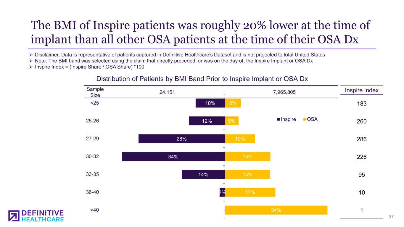 © Inspire Medical Systems, Inc. All Rights Reserved. • Inspire contracted with Definitive Healthcare to pull claims data on the OSA population with a focus on BMI at time of diagnosis • Focus on differences from Inspire therapy claims data to GLP-1 claims data • BMI is a factor in selecting therapy for OSA • BMI of Inspire patients ~20% lower at time of implant compared to other OSA patients at time of OSA diagnosis • Total number of OSA patient diagnoses continues to increase • Claims data identified >1,500 patients who were on a GLP-1 at the time of Inspire implant • These patients had a slightly higher BMI than total Inspire patients • Reduction in BMI is greatest for the 9-month and 1-year of GLP-1 patient cohorts • Post GLP-1 use, the largest movement in BMI bands is out of >40 while BMI<35 is growing 36 Summary of Third-Party OSA Data Including the use of GLP-1s