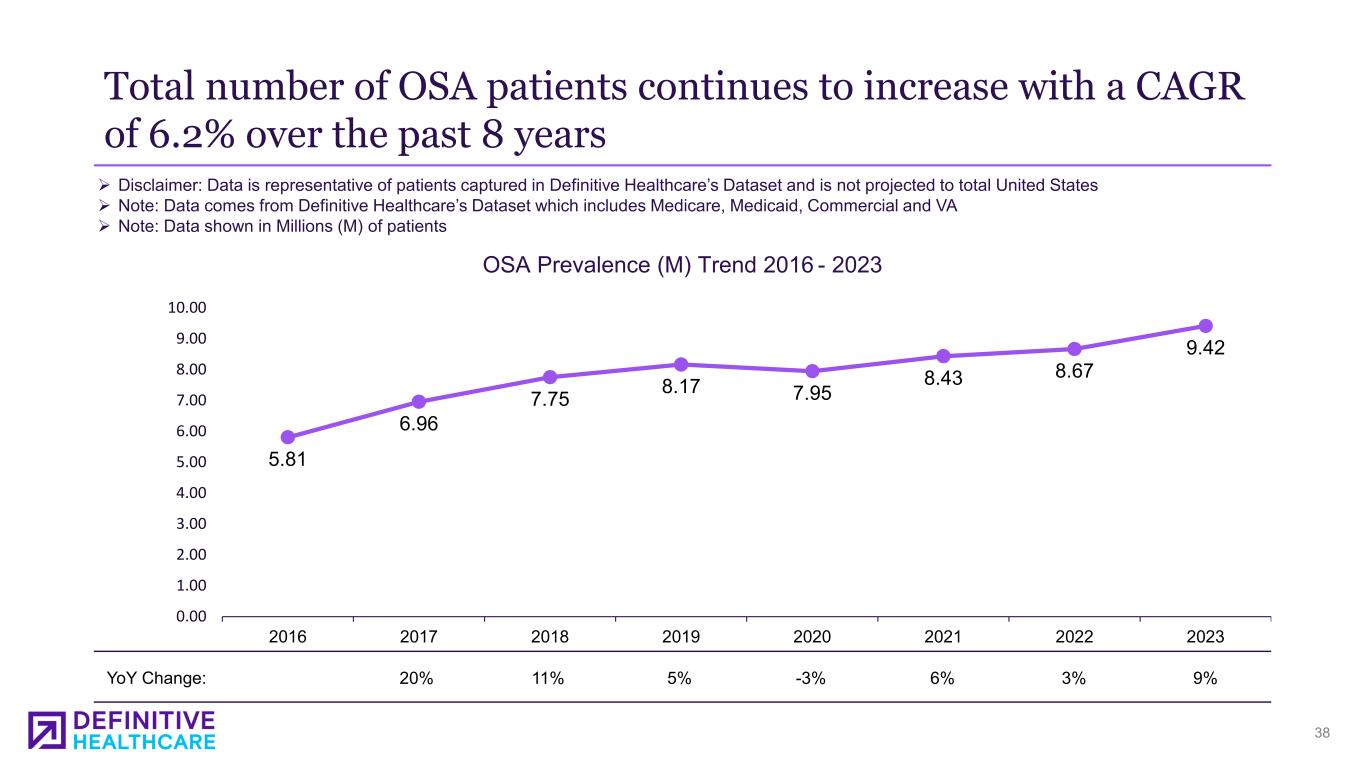 38 Total number of OSA patients continues to increase with a CAGR of 6.2% over the past 8 years 5.81 6.96 7.75 8.17 7.95 8.43 8.67 9.42 0.00 1.00 2.00 3.00 4.00 5.00 6.00 7.00 8.00 9.00 10.00 2016 2017 2018 2019 2020 2021 2022 2023 Disclaimer: Data is representative of patients captured in Definitive Healthcare’s Dataset and is not projected to total United States Note: Data comes from Definitive Healthcare’s Dataset which includes Medicare, Medicaid, Commercial and VA Note: Data shown in Millions (M) of patients OSA Prevalence (M) Trend 2016 - 2023 YoY Change: 20% 11% 5% -3% 6% 3% 9%