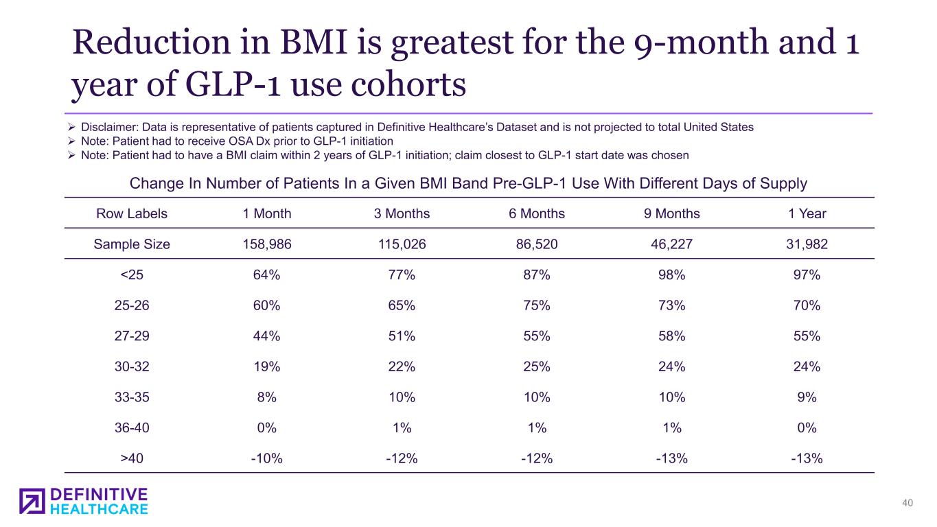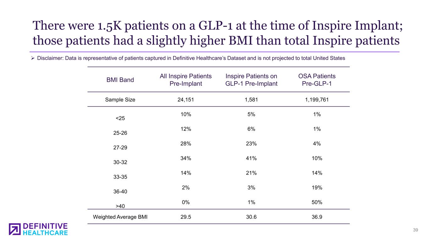There were 1.5K patients on a GLP-1 at the time of Inspire Implant; those patients had a slightly higher BMI than total Inspire patients 39 BMI Band All Inspire Patients Pre-Implant Inspire Patients on GLP-1 Pre-Implant OSA Patients Pre-GLP-1 Sample Size 24,151 1,581 1,199,761 <25 10% 5% 1% 25-26 12% 6% 1% 27-29 28% 23% 4% 30-32 34% 41% 10% 33-35 14% 21% 14% 36-40 2% 3% 19% >40 0% 1% 50% Weighted Average BMI 29.5 30.6 36.9 Disclaimer: Data is representative of patients captured in Definitive Healthcare’s Dataset and is not projected to total United States