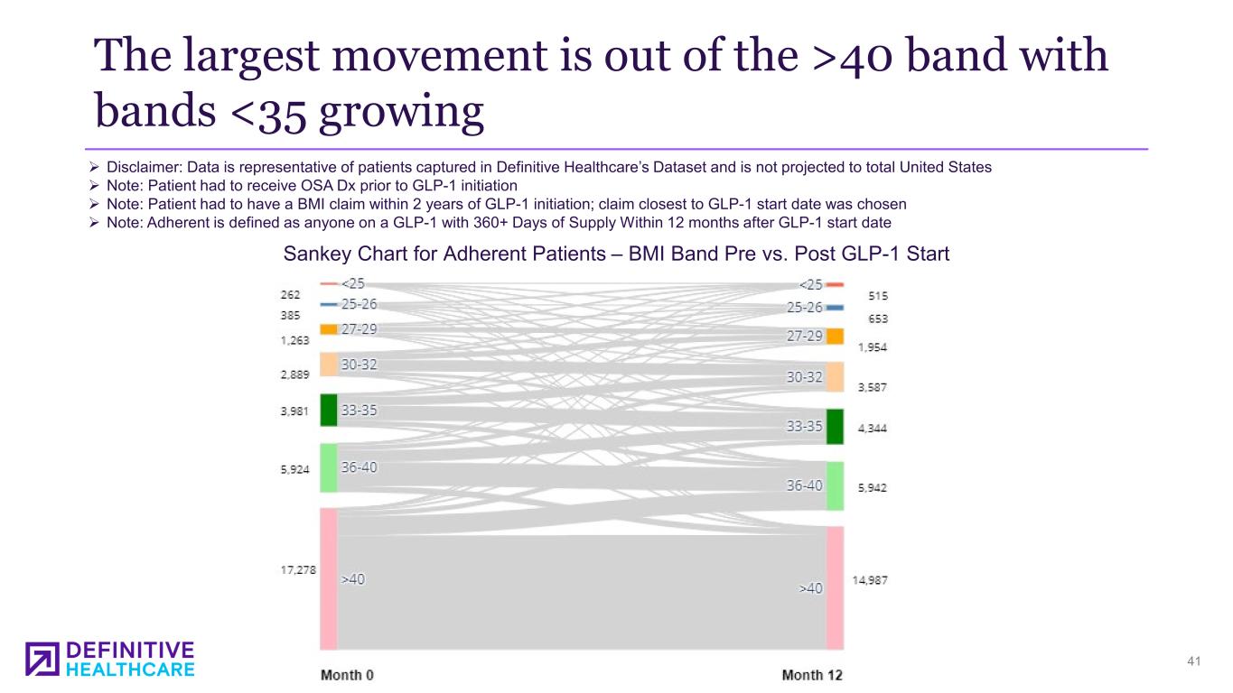 Reduction in BMI is greatest for the 9-month and 1 year of GLP-1 use cohorts 40 Row Labels 1 Month 3 Months 6 Months 9 Months 1 Year Sample Size 158,986 115,026 86,520 46,227 31,982 <25 64% 77% 87% 98% 97% 25-26 60% 65% 75% 73% 70% 27-29 44% 51% 55% 58% 55% 30-32 19% 22% 25% 24% 24% 33-35 8% 10% 10% 10% 9% 36-40 0% 1% 1% 1% 0% >40 -10% -12% -12% -13% -13% Disclaimer: Data is representative of patients captured in Definitive Healthcare’s Dataset and is not projected to total United States Note: Patient had to receive OSA Dx prior to GLP-1 initiation Note: Patient had to have a BMI claim within 2 years of GLP-1 initiation; claim closest to GLP-1 start date was chosen Change In Number of Patients In a Given BMI Band Pre-GLP-1 Use With Different Days of Supply
