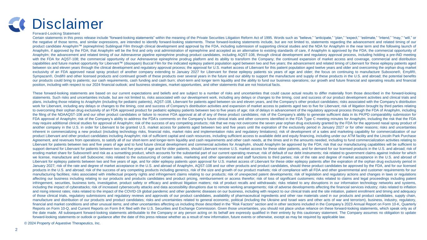 2 ® Disclaimer Forward-Looking Statement Certain statements in this press release include “forward-looking statements” within the meaning of the Private Securities Litigation Reform Act of 1995. Words such as “believe,” “anticipate,” “plan,” “expect,” “estimate,” “intend,” “may,” “will,” or the negative of those terms, and similar expressions, are intended to identify forward-looking statements. These forward-looking statements include, but are not limited to, statements regarding the advancement and related timing of our product candidate Anaphylm (epinephrine) Sublingual Film through clinical development and approval by the FDA, including submission of supporting clinical studies and the NDA for Anaphylm in the near term and the following launch of Anaphylm, if approved by the FDA; that Anaphylm will be the first and only oral administration of epinephrine and accepted as an alternative to existing standards of care, if Anaphylm is approved by the FDA; the commercial opportunity of Anaphylm; the advancement and related timing of our Adrenaverse pipeline epinephrine prodrug product candidates, including AQST-108, through clinical development and regulatory approval process, including holding a pre-IND meeting with the FDA for AQST-108; the commercial opportunity of our Adrenaverse epinephrine prodrug platform and its ability to transform the Company; the continued expansion of market access and coverage, commercial and distribution capabilities and future market opportunity for Libervant (diazepam) Buccal Film for the indicated epilepsy patient population aged between two and five years; the advancement and related timing of Libervant for these epilepsy patients aged between six and eleven years through the clinical development and regulatory approval process; the approval for U.S. market access of Libervant for this patient population aged twelve years and older and overcoming the orphan drug market exclusivity of an FDA approved nasal spray product of another company extending to January 2027 for Libervant for these epilepsy patients six years of age and older; the focus on continuing to manufacture Suboxone®, Emylif®, Sympazan®, Ondif® and other licensed products and continued growth of these products over several years in the future and our ability to support the manufacture and supply of these products in the U.S. and abroad; the potential benefits our products could bring to patients; our cash requirements, cash funding and cash burn; short-term and longer term liquidity and the ability to fund our business operations; our growth and future financial and operating results and financial position, including with respect to our 2024 financial outlook; and business strategies, market opportunities, and other statements that are not historical facts. These forward-looking statements are based on our current expectations and beliefs and are subject to a number of risks and uncertainties that could cause actual results to differ materially from those described in the forward-looking statements. Such risks and uncertainties include, but are not limited to, risks associated with our development work, including any delays or changes to the timing, cost and success of our product development activities and clinical trials and plans, including those relating to Anaphylm (including for pediatric patients), AQST-108, Libervant for patients aged between six and eleven years, and the Company's other product candidates; risks associated with the Company’s distribution work for Libervant, including any delays or changes to the timing, cost and success of Company's distribution activities and expansion of market access to patients aged two to five for Libervant; risk of litigation brought by third parties relating to overcoming their orphan drug exclusivity of an FDA approved product for pediatric epilepsy patients between two to five years of age; risk of delays in advancement of the regulatory approval process through the FDA of Anaphylm, including the filing of the NDAAQST-108 and our other product candidates or failure to receive FDA approval at all of any of these product candidates; risk of the Company’s ability to generate sufficient data in its PK/PD comparability submission for FDA approval of Anaphylm; risk of the Company’s ability to address the FDA’s comments on the Company’s future clinical trials and other concerns identified in the FDA Type C meeting minutes for Anaphylm, including the risk that the FDA may require additional clinical studies for approval of Anaphylm; risk of the success of any competing products; risk that we may not overcome the seven year orphan drug exclusivity granted by the FDA for the approved nasal spray product of another company in the U.S. in order for Libervant to be granted U.S. market access for patients aged between two and five years until the expiration of the exclusivity period in January 2027 or for other reasons; risks and uncertainties inherent in commercializing a new product (including technology risks, financial risks, market risks and implementation risks and regulatory limitations); risk of development of a sales and marketing capability for commercialization of our product Libervant and other product candidates including Anaphylm; risk of sufficient capital and cash resources, including sufficient access to available debt and equity financing, including under our ATM facility and the Lincoln Park Purchase Agreement, and revenues from operations, to satisfy all of our short-term and longer-term liquidity and cash requirements and other cash needs, at the times and in the amounts needed, including to fund commercialization activities relating to Libervant for patients between two and five years of age and to fund future clinical development and commercial activities for Anaphylm, should Anaphylm be approved by the FDA; risk that our manufacturing capabilities will be sufficient to support dema