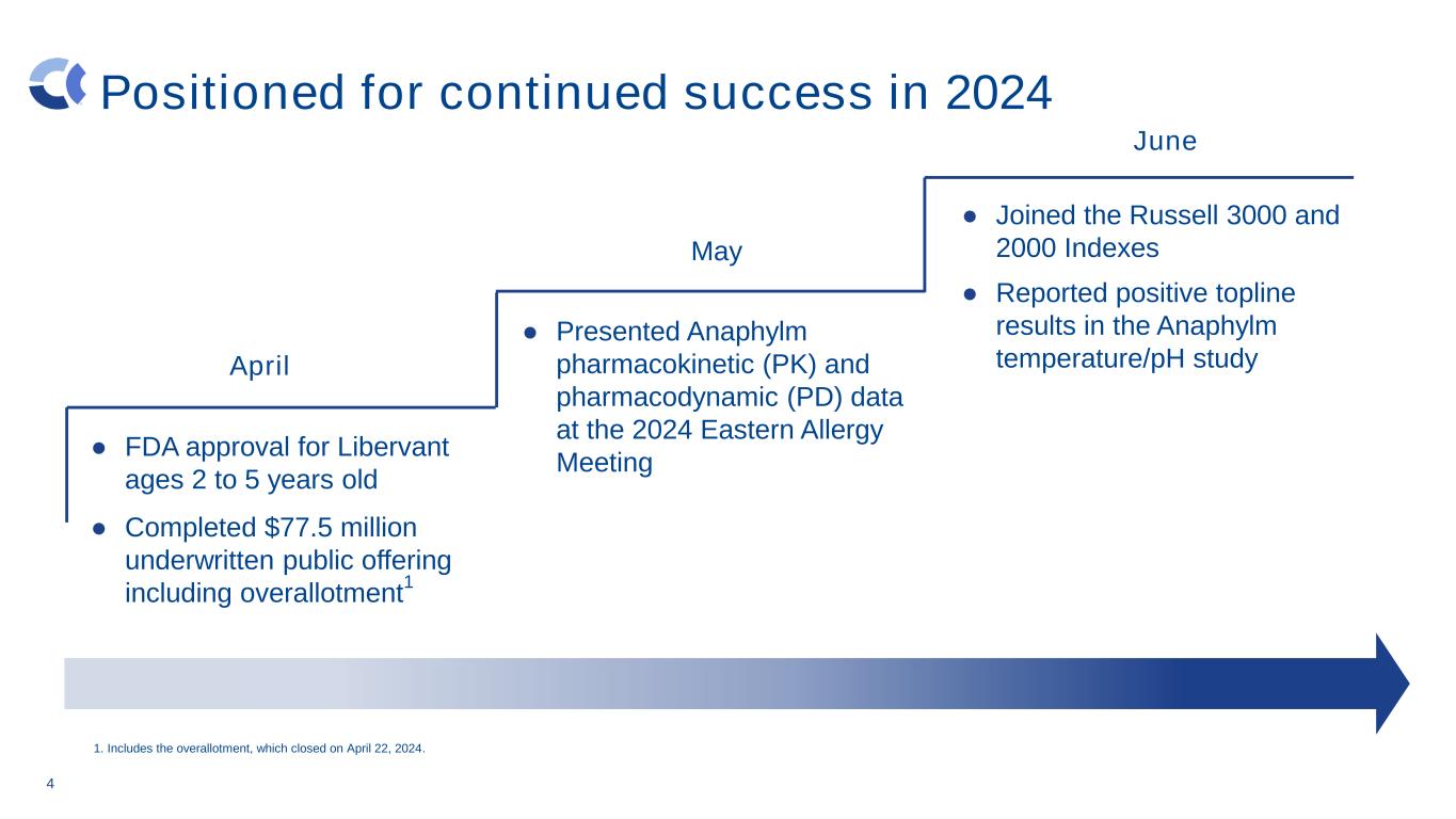 The Company’s remaining supportive study, the oral allergy syndrome (OAS) challenge study, is underway, and the study is expected to be completed late in the third quarter or early fourth quarter of 2024. The Company is maintaining its guidance of initiating a full product launch of Anaphylm, if approved by the U.S. Food and Drug Administration (FDA), at the end of 2025 or in the first quarter of 2026. This is based on completing an NDA submission with the FDA in the first quarter of 2025.