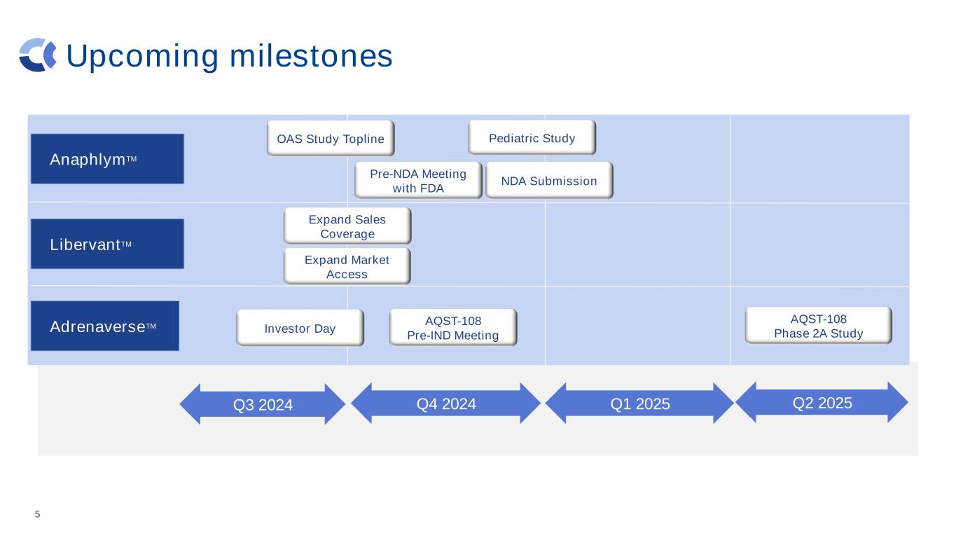 4 Positioned for continued success in 2024 ● FDA approval for Libervant ages 2 to 5 years old ● Completed $77.5 million underwritten public offering including overallotment 1 May ● Presented Anaphylm pharmacokinetic (PK) and pharmacodynamic (PD) data at the 2024 Eastern Allergy Meeting April ● Joined the Russell 3000 and 2000 Indexes ● Reported positive topline results in the Anaphylm temperature/pH study June 1. Includes the overallotment, which closed on April 22, 2024.