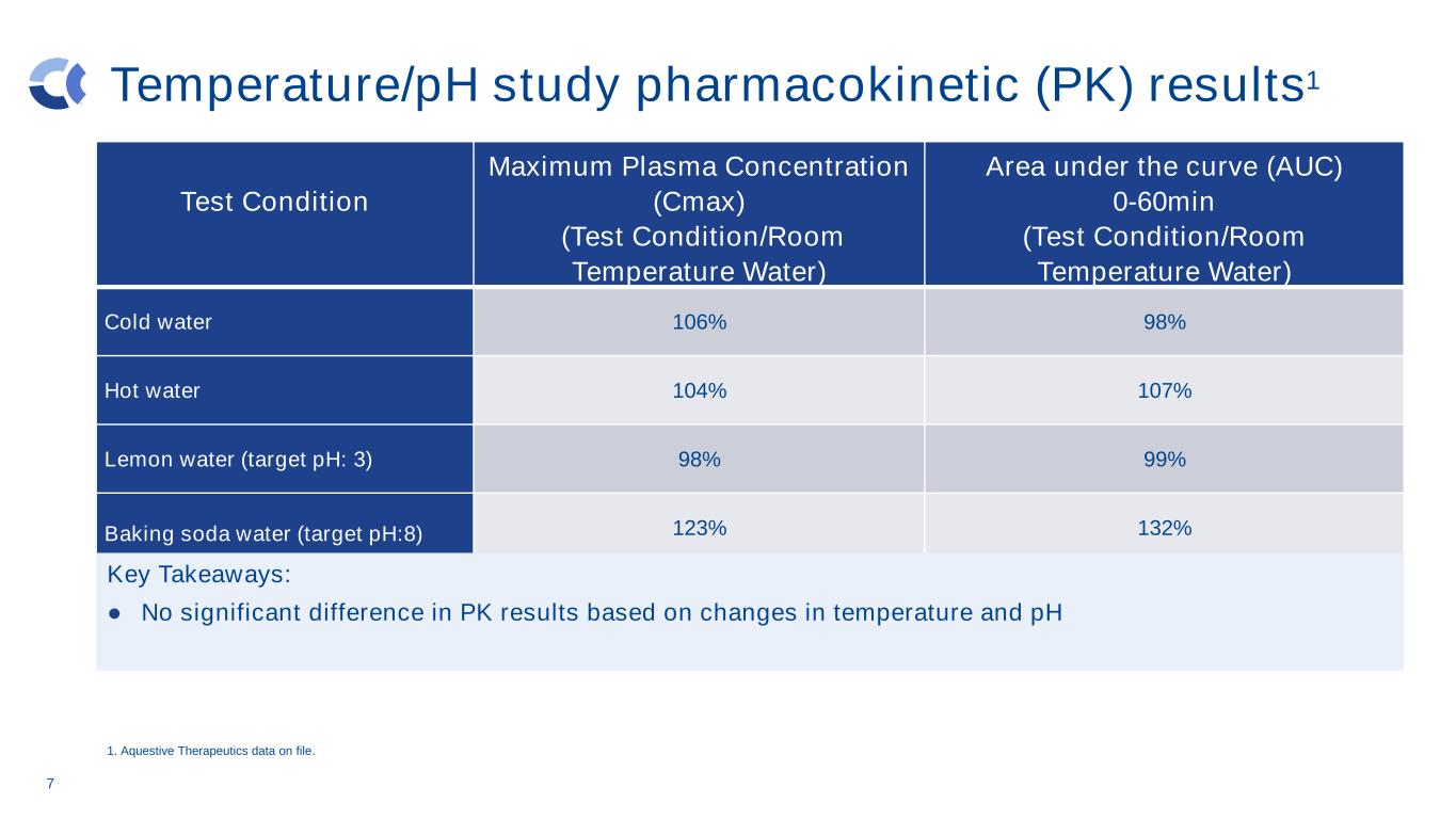 In June 2024, Aquestive reported positive topline pharmacokinetic (PK) data from the temperature / pH study of Anaphylm™. The single-dose, five-period, randomized crossover study was designed to compare the PK and pharmacodynamics (PD) of Anaphylm just after consuming normal water at different temperatures (hot, cold, and room temperature) as well as water of different pHs (acidic - lemon water, and basic- baking soda water). The most consumed beverages, such as soda, milk, coffee, and juice, have acidity between lemon water and normal water. The primary PK parameters were the maximum amount of epinephrine measured in plasma (Cmax) and exposure, or the area under the curve (AUC), at predefined time points after dosing, in 30 healthy adult subjects. Topline PK and PD data from the study showed no statistically significant difference in PK and PD results between the different groups based on temperature and pH variability in the mouth.