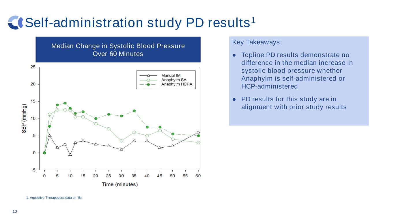 10 Self-administration study PD results1 Key Takeaways: ● Topline PD results demonstrate no difference in the median increase in systolic blood pressure whether Anaphylm is self-administered or HCP-administered ● PD results for this study are in alignment with prior study results Median Change in Systolic Blood Pressure Over 60 Minutes 1. Aquestive Therapeutics data on file.