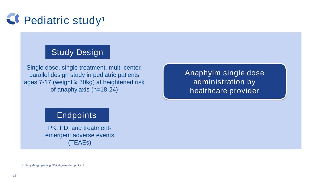 Pediatric study1 12 Single dose, single treatment, multi-center, parallel design study in pediatric patients ages 7-17 (weight ≥ 30kg) at heightened risk of anaphylaxis (n=18-24) PK, PD, and treatment- emergent adverse events (TEAEs) Adrenalin (IM) no allergen exposure Anaphylm single dose administration by healthcare provider 1. Study design pending FDA alignment on protocol. Study Design Endpoints