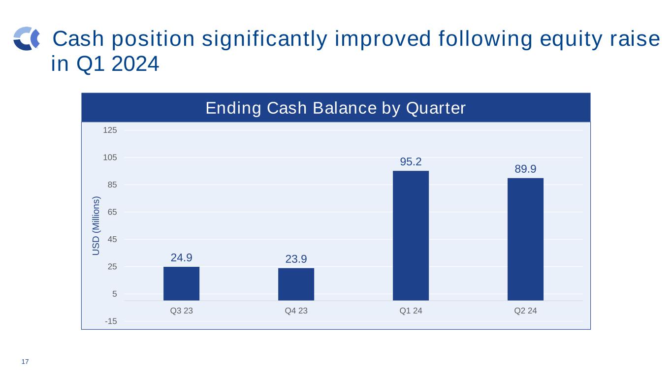 • Finishes the second quarter 2024 with cash and cash equivalents of approximately $90 million and reaffirms cash runway into 2026