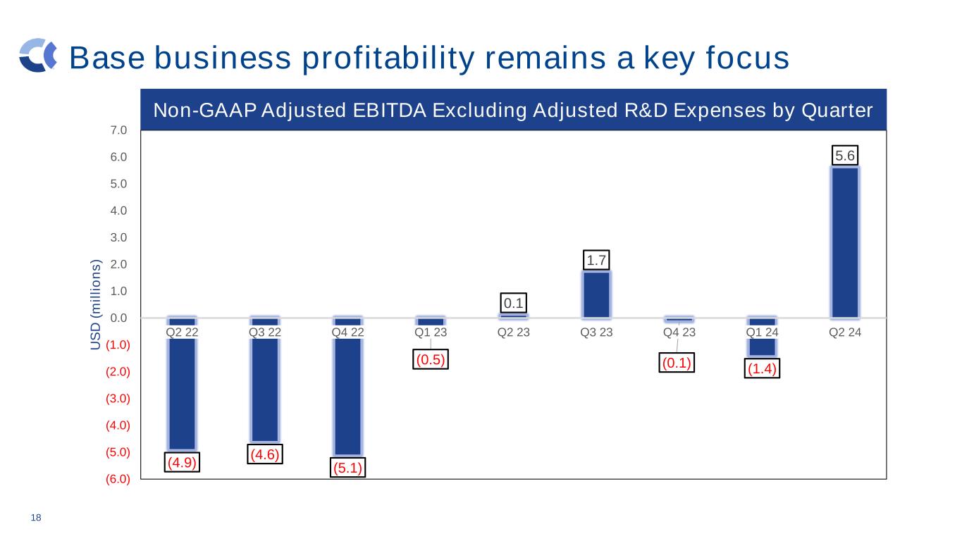 Non-GAAP adjusted EBITDA income was $1.8 million in the second quarter 2024, compared to non-GAAP adjusted EBITDA loss of $3.3 million in the second quarter 2023. Non-GAAP adjusted EBITDA income excluding adjusted R&D expenses was $5.6 million in the second quarter 2024, compared to a non-GAAP adjusted EBITDA income excluding adjusted R&D expenses of $0.1 million in the second quarter 2023.