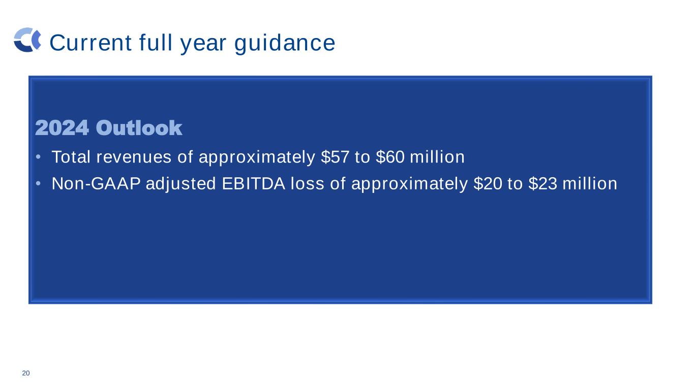 Current full year guidance 20 2024 Outlook • Total revenues of approximately $57 to $60 million • Non-GAAP adjusted EBITDA loss of approximately $20 to $23 million