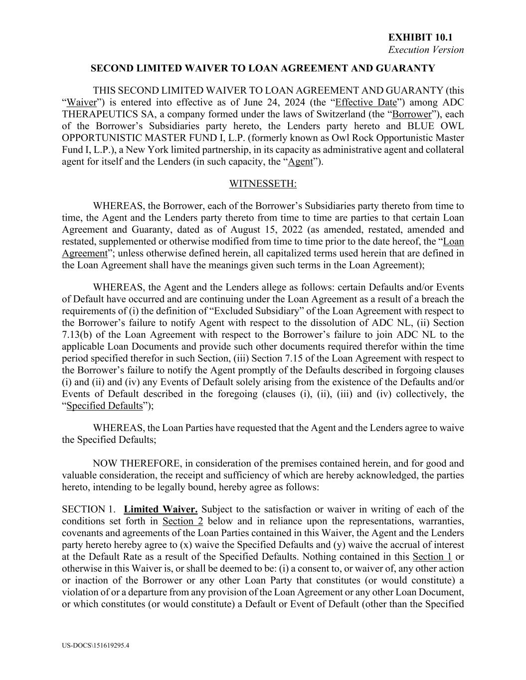 EXHIBIT 10.1 Execution Version US-DOCS\151619295.4 SECOND LIMITED WAIVER TO LOAN AGREEMENT AND GUARANTY THIS SECOND LIMITED WAIVER TO LOAN AGREEMENT AND GUARANTY (this “Waiver”) is entered into effective as of June 24, 2024 (the “Effective Date”) among ADC THERAPEUTICS SA, a company formed under the laws of Switzerland (the “Borrower”), each of the Borrower’s Subsidiaries party hereto, the Lenders party hereto and BLUE OWL OPPORTUNISTIC MASTER FUND I, L.P. (formerly known as Owl Rock Opportunistic Master Fund I, L.P.), a New York limited partnership, in its capacity as administrative agent and collateral agent for itself and the Lenders (in such capacity, the “Agent”). WITNESSETH: WHEREAS, the Borrower, each of the Borrower’s Subsidiaries party thereto from time to time, the Agent and the Lenders party thereto from time to time are parties to that certain Loan Agreement and Guaranty, dated as of August 15, 2022 (as amended, restated, amended and restated, supplemented or otherwise modified from time to time prior to the date hereof, the “Loan Agreement”; unless otherwise defined herein, all capitalized terms used herein that are defined in the Loan Agreement shall have the meanings given such terms in the Loan Agreement); WHEREAS, the Agent and the Lenders allege as follows: certain Defaults and/or Events of Default have occurred and are continuing under the Loan Agreement as a result of a breach the requirements of (i) the definition of “Excluded Subsidiary” of the Loan Agreement with respect to the Borrower’s failure to notify Agent with respect to the dissolution of ADC NL, (ii) Section 7.13(b) of the Loan Agreement with respect to the Borrower’s failure to join ADC NL to the applicable Loan Documents and provide such other documents required therefor within the time period specified therefor in such Section, (iii) Section 7.15 of the Loan Agreement with respect to the Borrower’s failure to notify the Agent promptly of the Defaults described in forgoing clauses (i) and (ii) and (iv) any Events of Default solely arising from the existence of the Defaults and/or Events of Default described in the foregoing (clauses (i), (ii), (iii) and (iv) collectively, the “Specified Defaults”); WHEREAS, the Loan Parties have requested that the Agent and the Lenders agree to waive the Specified Defaults; NOW THEREFORE, in consideration of the premises contained herein, and for good and valuable consideration, the receipt and sufficiency of which are hereby acknowledged, the parties hereto, intending to be legally bound, hereby agree as follows: SECTION 1. Limited Waiver. Subject to the satisfaction or waiver in writing of each of the conditions set forth in Section 2 below and in reliance upon the representations, warranties, covenants and agreements of the Loan Parties contained in this Waiver, the Agent and the Lenders party hereto hereby agree to (x) waive the Specified Defaults and (y) waive the accrual of interest at the Default Rate as a result of the Specified Defaults. Nothing contained in this Section 1 or otherwise in this Waiver is, or shall be deemed to be: (i) a consent to, or waiver of, any other action or inaction of the Borrower or any other Loan Party that constitutes (or would constitute) a violation of or a departure from any provision of the Loan Agreement or any other Loan Document, or which constitutes (or would constitute) a Default or Event of Default (other than the Specified