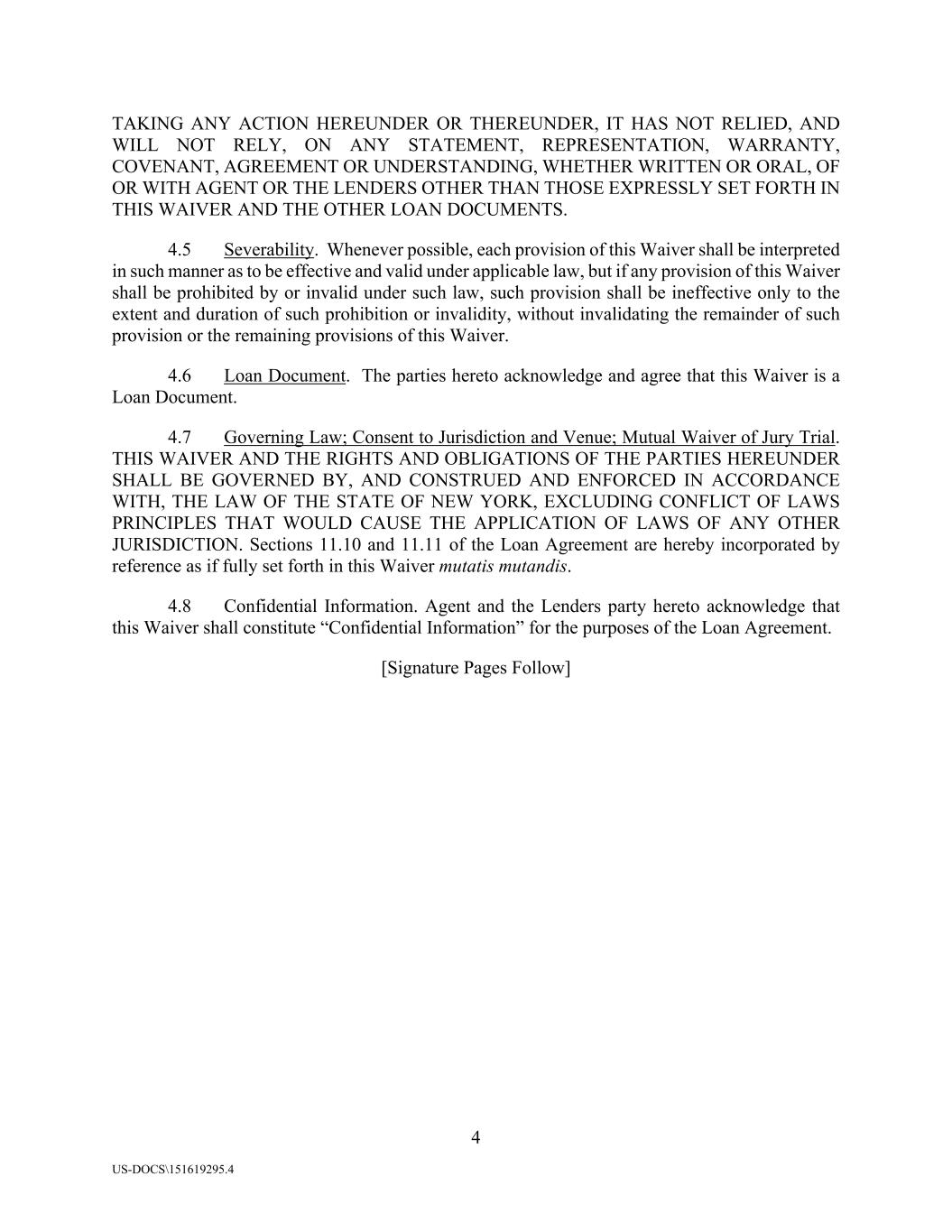 4 US-DOCS\151619295.4 TAKING ANY ACTION HEREUNDER OR THEREUNDER, IT HAS NOT RELIED, AND WILL NOT RELY, ON ANY STATEMENT, REPRESENTATION, WARRANTY, COVENANT, AGREEMENT OR UNDERSTANDING, WHETHER WRITTEN OR ORAL, OF OR WITH AGENT OR THE LENDERS OTHER THAN THOSE EXPRESSLY SET FORTH IN THIS WAIVER AND THE OTHER LOAN DOCUMENTS. 4.5 Severability. Whenever possible, each provision of this Waiver shall be interpreted in such manner as to be effective and valid under applicable law, but if any provision of this Waiver shall be prohibited by or invalid under such law, such provision shall be ineffective only to the extent and duration of such prohibition or invalidity, without invalidating the remainder of such provision or the remaining provisions of this Waiver. 4.6 Loan Document. The parties hereto acknowledge and agree that this Waiver is a Loan Document. 4.7 Governing Law; Consent to Jurisdiction and Venue; Mutual Waiver of Jury Trial. THIS WAIVER AND THE RIGHTS AND OBLIGATIONS OF THE PARTIES HEREUNDER SHALL BE GOVERNED BY, AND CONSTRUED AND ENFORCED IN ACCORDANCE WITH, THE LAW OF THE STATE OF NEW YORK, EXCLUDING CONFLICT OF LAWS PRINCIPLES THAT WOULD CAUSE THE APPLICATION OF LAWS OF ANY OTHER JURISDICTION. Sections 11.10 and 11.11 of the Loan Agreement are hereby incorporated by reference as if fully set forth in this Waiver mutatis mutandis. 4.8 Confidential Information. Agent and the Lenders party hereto acknowledge that this Waiver shall constitute “Confidential Information” for the purposes of the Loan Agreement. [Signature Pages Follow]