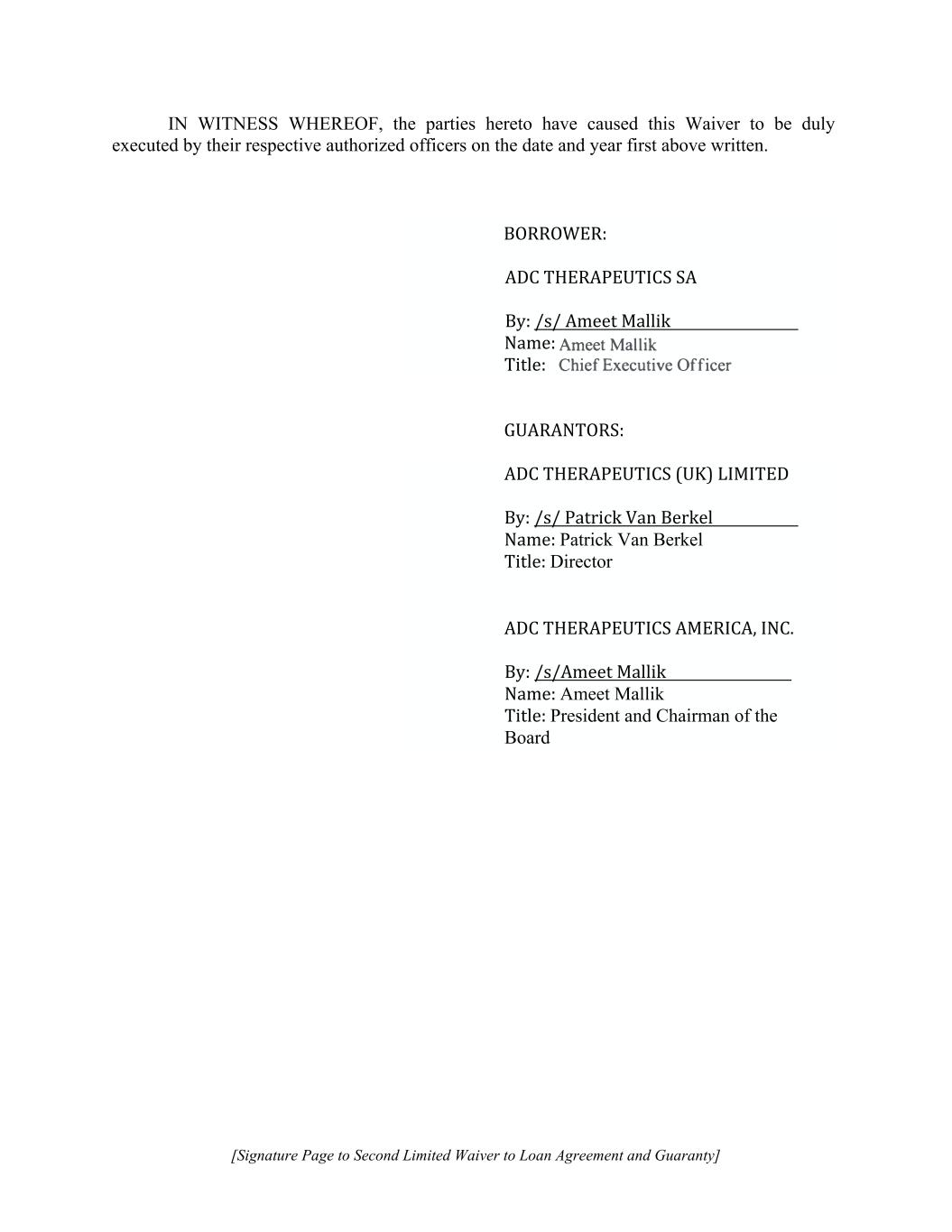 [Signature Page to Second Limited Waiver to Loan Agreement and Guaranty] IN WITNESS WHEREOF, the parties hereto have caused this Waiver to be duly executed by their respective authorized officers on the date and year first above written. Name:Title: GUARANTORS:ADC THERAPEUTICS (UK) LIMITEDBy: /s/ Patrick Van BerkelName: Patrick Van Berkel Title: Director ADC THERAPEUTICS AMERICA, INC.By: /s/Ameet MallikName: Ameet Mallik Title: President and Chairman of the Board BORROWER:ADC THERAPEUTICS SA By: /s/ Ameet Mallik Ameet Mallik Chief Executive Officer