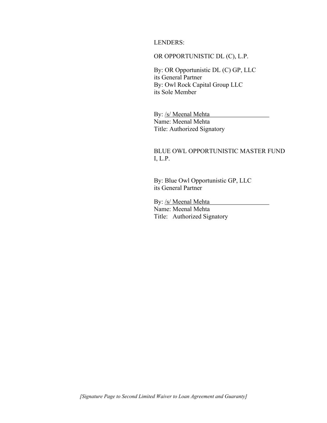[Signature Page to Second Limited Waiver to Loan Agreement and Guaranty] LENDERS: OR OPPORTUNISTIC DL (C), L.P. By: OR Opportunistic DL (C) GP, LLC its General Partner By: Owl Rock Capital Group LLC its Sole Member By: /s/ Meenal Mehta Name: Meenal Mehta Title: Authorized Signatory BLUE OWL OPPORTUNISTIC MASTER FUND I, L.P. By: Blue Owl Opportunistic GP, LLC its General Partner By: /s/ Meenal Mehta Name: Meenal Mehta Title: Authorized Signatory