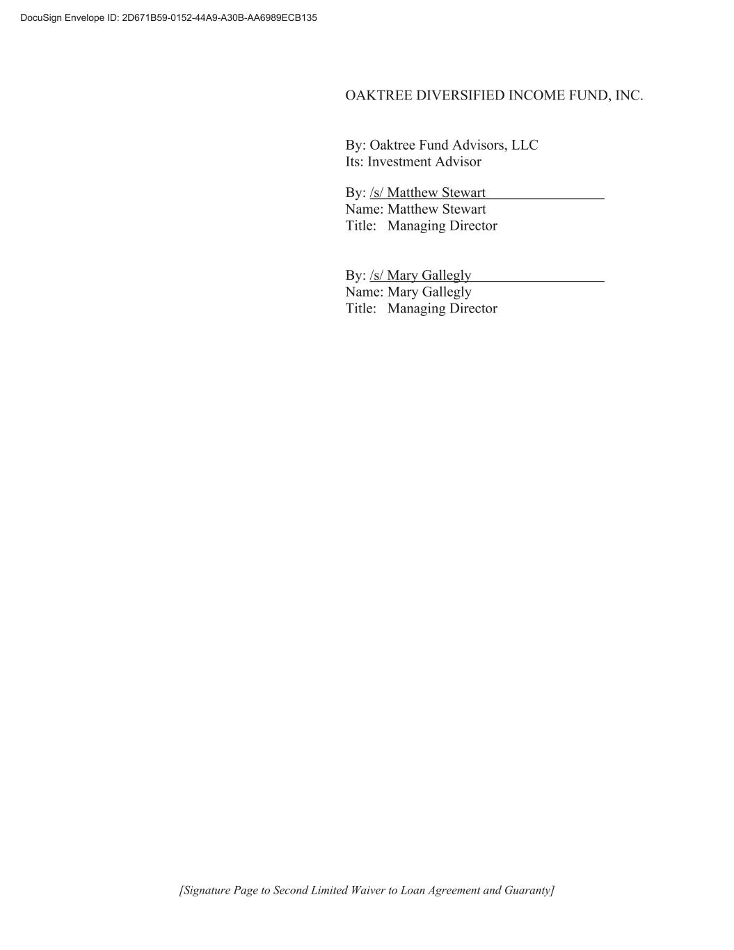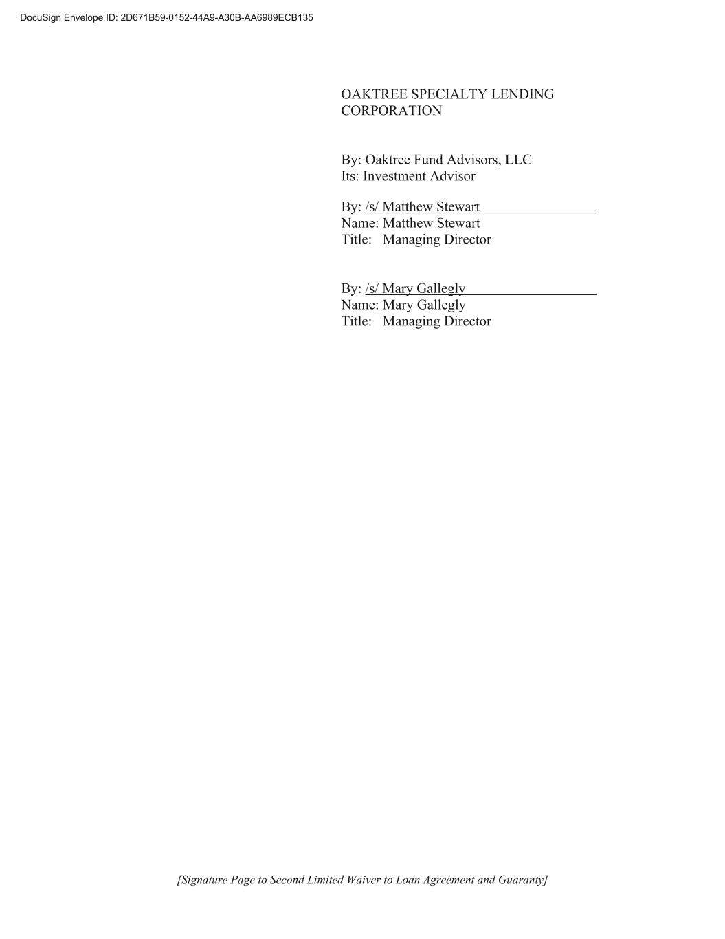 [Signature Page to Second Limited Waiver to Loan Agreement and Guaranty] OAKTREE DIVERSIFIED INCOME FUND, INC. By: Oaktree Fund Advisors, LLC Its: Investment Advisor By: /s/ Matthew Stewart Name: Matthew Stewart Title: Managing Director By: /s/ Mary Gallegly Name: Mary Gallegly Title: Managing Director