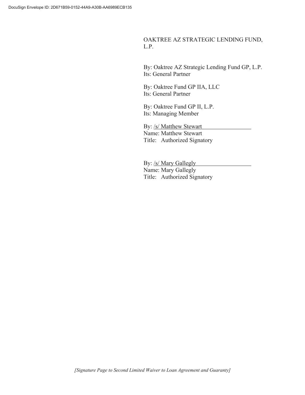 [Signature Page to Second Limited Waiver to Loan Agreement and Guaranty] OAKTREE AZ STRATEGIC LENDING FUND, L.P. By: Oaktree AZ Strategic Lending Fund GP, L.P. Its: General Partner By: Oaktree Fund GP IIA, LLC Its: General Partner By: Oaktree Fund GP II, L.P. Its: Managing Member By: /s/ Matthew Stewart Name: Matthew Stewart Title: Authorized Signatory By: /s/ Mary Gallegly Name: Mary Gallegly Title: Authorized Signatory