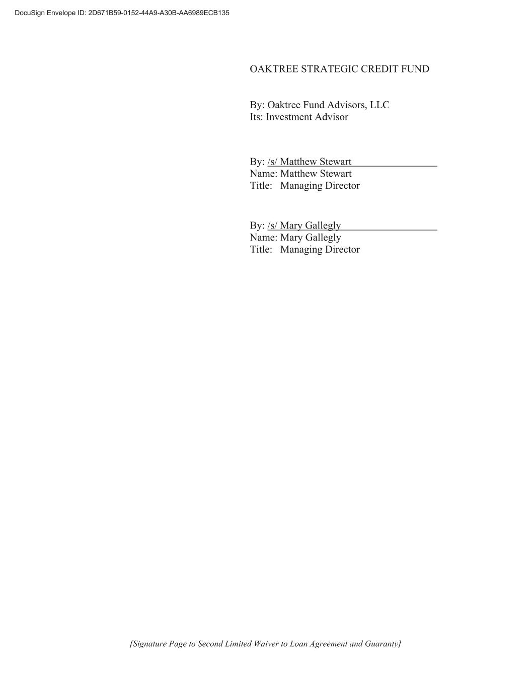 [Signature Page to Second Limited Waiver to Loan Agreement and Guaranty] OAKTREE STRATEGIC CREDIT FUND By: Oaktree Fund Advisors, LLC Its: Investment Advisor By: /s/ Matthew Stewart Name: Matthew Stewart Title: Managing Director By: /s/ Mary Gallegly Name: Mary Gallegly Title: Managing Director