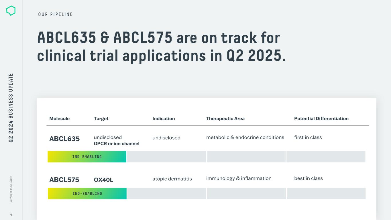 ●ABCL635 and ABCL575 remain on track for anticipated Clinical Trial Applications (CTAs) in the second quarter of 2025.