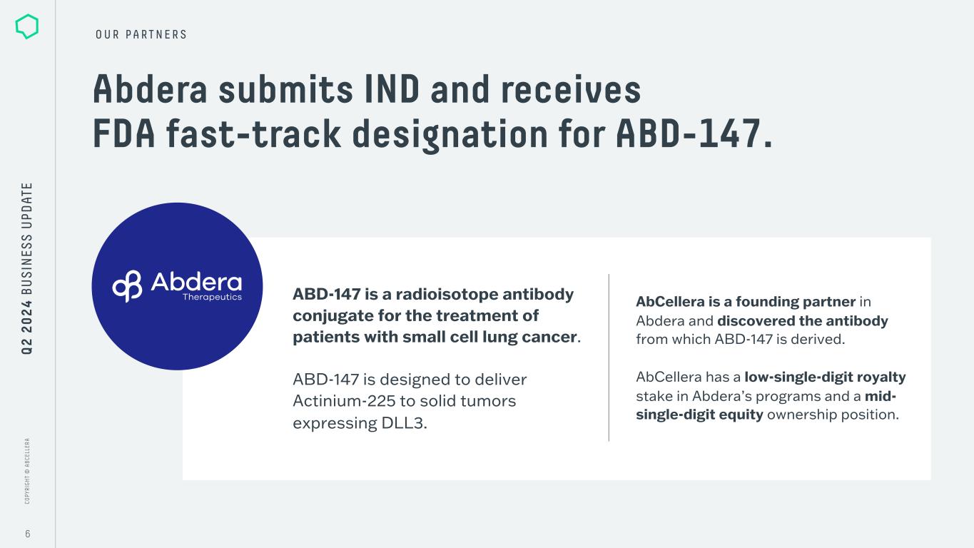 C O PY R IG H T © A B C EL LE R A C O PY R IG H T © A B C EL LE R A 6 O U R P A R T N E R S Q 2 2 0 2 4 B U S IN ES S U PD AT E Abdera submits IND and receives FDA fast-track designation for ABD-147. ABD-147 is a radioisotope antibody conjugate for the treatment of patients with small cell lung cancer. ABD-147 is designed to deliver Actinium-225 to solid tumors expressing DLL3. AbCellera is a founding partner in Abdera and discovered the antibody from which ABD-147 is derived. AbCellera has a low-single-digit royalty stake in Abdera’s programs and a mid- single-digit equity ownership position.