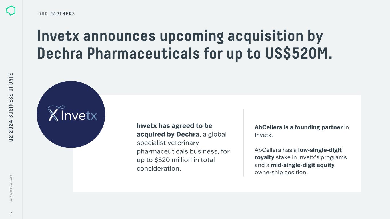●On July 18, 2024, Invetx announced its upcoming acquisition by Dechra Pharmaceuticals for up to $520 million in total consideration. AbCellera is a founding partner in Invetx, has a low-single-digit royalty stake in Invetx’s programs, and has a mid-single-digit equity ownership position.