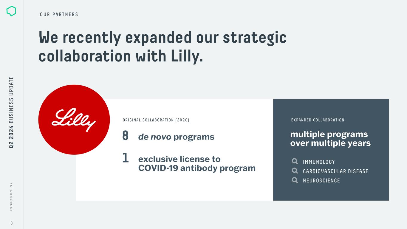 ●On July 31, 2024, announced an expanded collaboration with Lilly to discover therapeutic antibodies for programs in immunology, cardiovascular disease, and neuroscience.