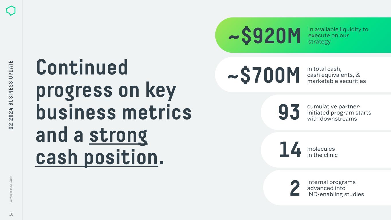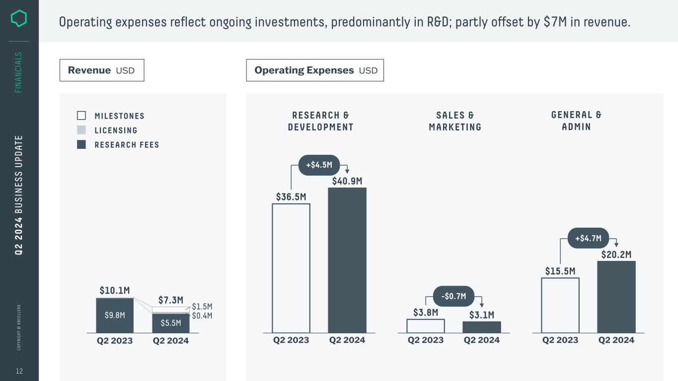 ●Revenue – Total revenue was $7.3 million, compared to $10.1 million in Q2 2023. Partnerships generated research fees of $5.5 million, compared to $9.8 million in Q2 2023. Milestone payments contributed $1.5 million in the quarter.