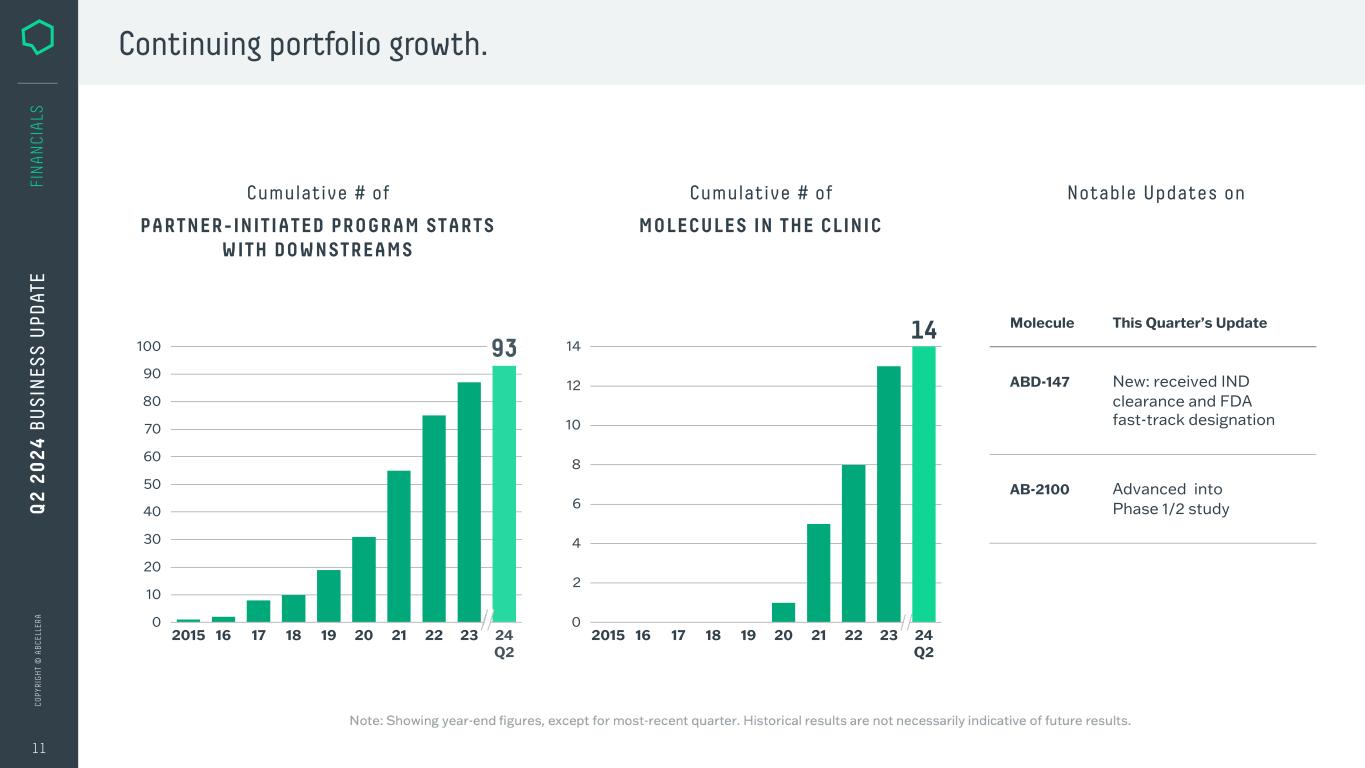 AbCellera started discovery on an additional three partner-initiated programs with downstreams to reach a cumulative total of 93 partner-initiated program starts with downstreams in Q2 2024 (up from 80 on June 30, 2023). AbCellera’s partners have advanced a cumulative total of 14 molecules into the clinic (up from nine on June 30, 2023).