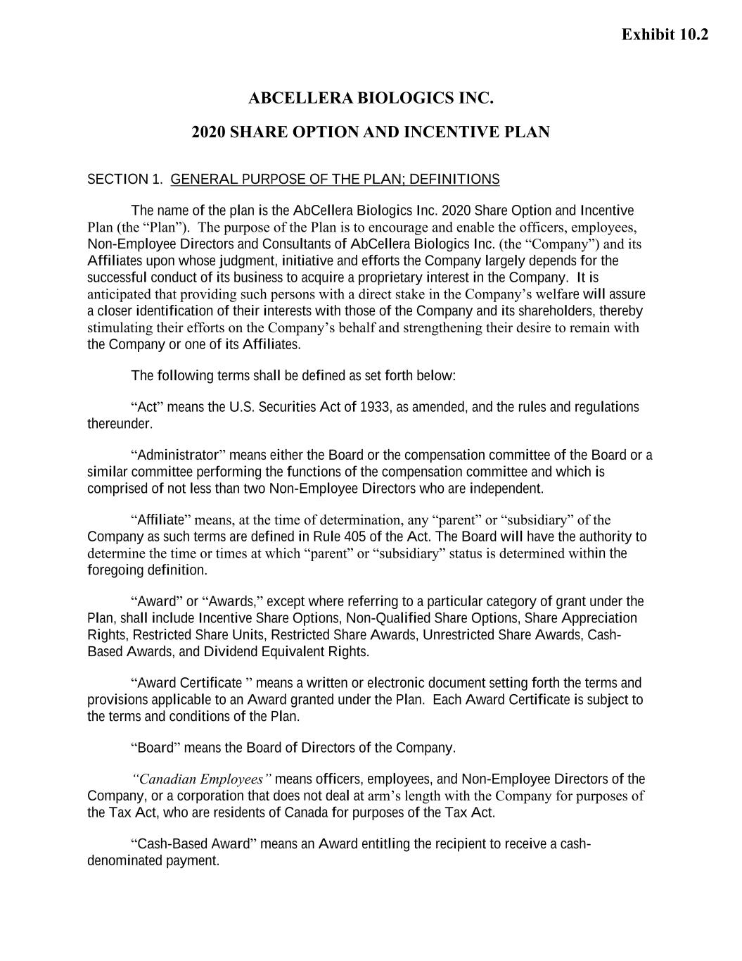 ABCELLERA BIOLOGICS INC. 2020 SHARE OPTION AND INCENTIVE PLAN SECTION 1. GENERAL PURPOSE OF THE PLAN; DEFINITIONS The name of the plan is the AbCellera Biologics Inc. 2020 Share Option and Incentive Plan (the “Plan”). The purpose of the Plan is to encourage and enable the officers, employees, Non-Employee Directors and Consultants of AbCellera Biologics Inc. (the “Company”) and its Affiliates upon whose judgment, initiative and efforts the Company largely depends for the successful conduct of its business to acquire a proprietary interest in the Company. It is anticipated that providing such persons with a direct stake in the Company’s welfare will assure a closer identification of their interests with those of the Company and its shareholders, thereby stimulating their efforts on the Company’s behalf and strengthening their desire to remain with the Company or one of its Affiliates. The following terms shall be defined as set forth below: “Act” means the U.S. Securities Act of 1933, as amended, and the rules and regulations thereunder. “Administrator” means either the Board or the compensation committee of the Board or a similar committee performing the functions of the compensation committee and which is comprised of not less than two Non-Employee Directors who are independent. “Affiliate” means, at the time of determination, any “parent” or “subsidiary” of the Company as such terms are defined in Rule 405 of the Act. The Board will have the authority to determine the time or times at which “parent” or “subsidiary” status is determined within the foregoing definition. “Award” or “Awards,” except where referring to a particular category of grant under the Plan, shall include Incentive Share Options, Non-Qualified Share Options, Share Appreciation Rights, Restricted Share Units, Restricted Share Awards, Unrestricted Share Awards, Cash- Based Awards, and Dividend Equivalent Rights. “Award Certificate ” means a written or electronic document setting forth the terms and provisions applicable to an Award granted under the Plan. Each Award Certificate is subject to the terms and conditions of the Plan. “Board” means the Board of Directors of the Company. “Canadian Employees” means officers, employees, and Non-Employee Directors of the Company, or a corporation that does not deal at arm’s length with the Company for purposes of the Tax Act, who are residents of Canada for purposes of the Tax Act. “Cash-Based Award” means an Award entitling the recipient to receive a cash- denominated payment. Exhibit 10.2