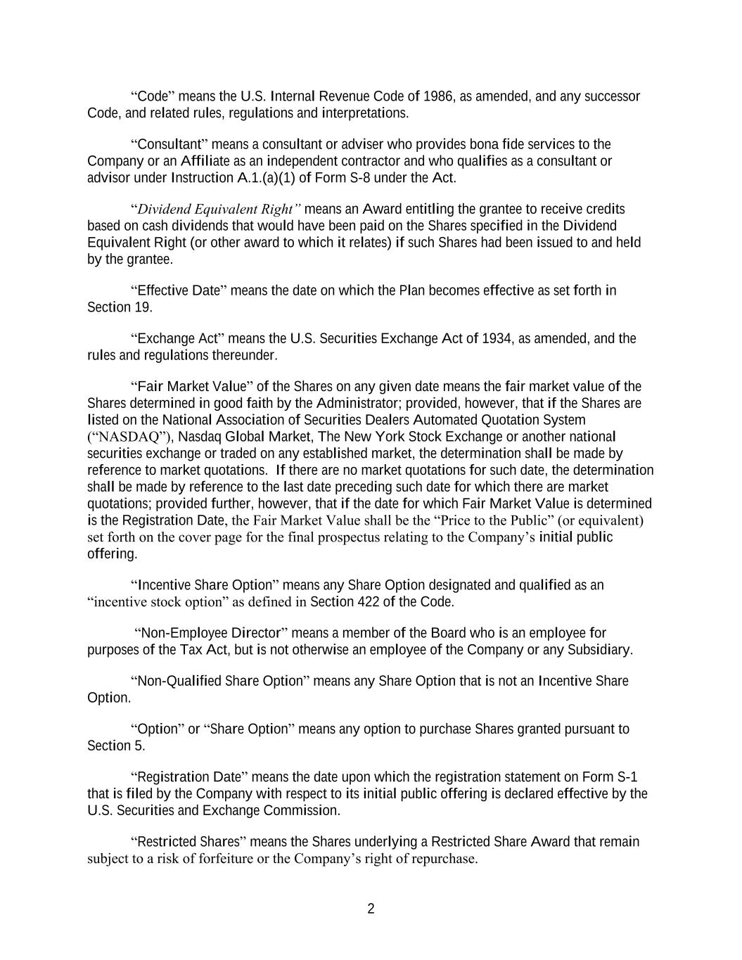 2 “Code” means the U.S. Internal Revenue Code of 1986, as amended, and any successor Code, and related rules, regulations and interpretations. “Consultant” means a consultant or adviser who provides bona fide services to the Company or an Affiliate as an independent contractor and who qualifies as a consultant or advisor under Instruction A.1.(a)(1) of Form S-8 under the Act. “Dividend Equivalent Right” means an Award entitling the grantee to receive credits based on cash dividends that would have been paid on the Shares specified in the Dividend Equivalent Right (or other award to which it relates) if such Shares had been issued to and held by the grantee. “Effective Date” means the date on which the Plan becomes effective as set forth in Section 19. “Exchange Act” means the U.S. Securities Exchange Act of 1934, as amended, and the rules and regulations thereunder. “Fair Market Value” of the Shares on any given date means the fair market value of the Shares determined in good faith by the Administrator; provided, however, that if the Shares are listed on the National Association of Securities Dealers Automated Quotation System (“NASDAQ”), Nasdaq Global Market, The New York Stock Exchange or another national securities exchange or traded on any established market, the determination shall be made by reference to market quotations. If there are no market quotations for such date, the determination shall be made by reference to the last date preceding such date for which there are market quotations; provided further, however, that if the date for which Fair Market Value is determined is the Registration Date, the Fair Market Value shall be the “Price to the Public” (or equivalent) set forth on the cover page for the final prospectus relating to the Company’s initial public offering. “Incentive Share Option” means any Share Option designated and qualified as an “incentive stock option” as defined in Section 422 of the Code. “Non-Employee Director” means a member of the Board who is an employee for purposes of the Tax Act, but is not otherwise an employee of the Company or any Subsidiary. “Non-Qualified Share Option” means any Share Option that is not an Incentive Share Option. “Option” or “Share Option” means any option to purchase Shares granted pursuant to Section 5. “Registration Date” means the date upon which the registration statement on Form S-1 that is filed by the Company with respect to its initial public offering is declared effective by the U.S. Securities and Exchange Commission. “Restricted Shares” means the Shares underlying a Restricted Share Award that remain subject to a risk of forfeiture or the Company’s right of repurchase.