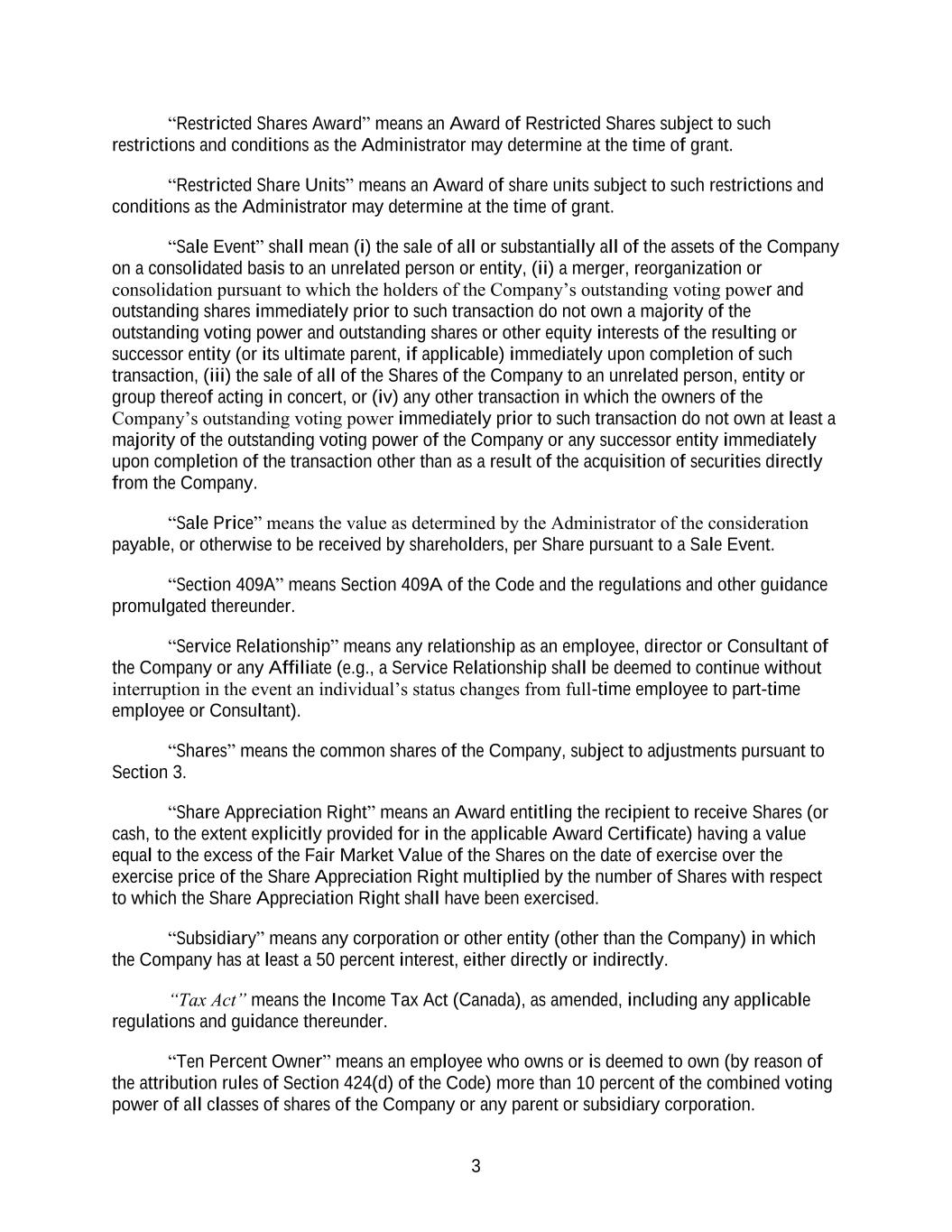 3 “Restricted Shares Award” means an Award of Restricted Shares subject to such restrictions and conditions as the Administrator may determine at the time of grant. “Restricted Share Units” means an Award of share units subject to such restrictions and conditions as the Administrator may determine at the time of grant. “Sale Event” shall mean (i) the sale of all or substantially all of the assets of the Company on a consolidated basis to an unrelated person or entity, (ii) a merger, reorganization or consolidation pursuant to which the holders of the Company’s outstanding voting power and outstanding shares immediately prior to such transaction do not own a majority of the outstanding voting power and outstanding shares or other equity interests of the resulting or successor entity (or its ultimate parent, if applicable) immediately upon completion of such transaction, (iii) the sale of all of the Shares of the Company to an unrelated person, entity or group thereof acting in concert, or (iv) any other transaction in which the owners of the Company’s outstanding voting power immediately prior to such transaction do not own at least a majority of the outstanding voting power of the Company or any successor entity immediately upon completion of the transaction other than as a result of the acquisition of securities directly from the Company. “Sale Price” means the value as determined by the Administrator of the consideration payable, or otherwise to be received by shareholders, per Share pursuant to a Sale Event. “Section 409A” means Section 409A of the Code and the regulations and other guidance promulgated thereunder. “Service Relationship” means any relationship as an employee, director or Consultant of the Company or any Affiliate (e.g., a Service Relationship shall be deemed to continue without interruption in the event an individual’s status changes from full-time employee to part-time employee or Consultant). “Shares” means the common shares of the Company, subject to adjustments pursuant to Section 3. “Share Appreciation Right” means an Award entitling the recipient to receive Shares (or cash, to the extent explicitly provided for in the applicable Award Certificate) having a value equal to the excess of the Fair Market Value of the Shares on the date of exercise over the exercise price of the Share Appreciation Right multiplied by the number of Shares with respect to which the Share Appreciation Right shall have been exercised. “Subsidiary” means any corporation or other entity (other than the Company) in which the Company has at least a 50 percent interest, either directly or indirectly. “Tax Act” means the Income Tax Act (Canada), as amended, including any applicable regulations and guidance thereunder. “Ten Percent Owner” means an employee who owns or is deemed to own (by reason of the attribution rules of Section 424(d) of the Code) more than 10 percent of the combined voting power of all classes of shares of the Company or any parent or subsidiary corporation.