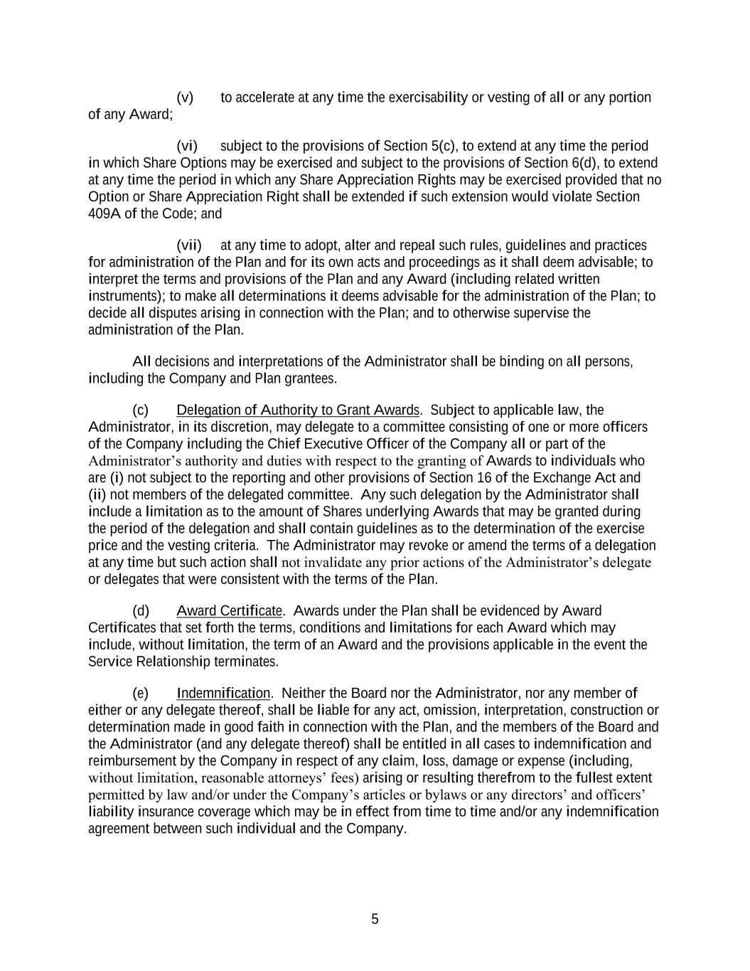 5 (v) to accelerate at any time the exercisability or vesting of all or any portion of any Award; (vi) subject to the provisions of Section 5(c), to extend at any time the period in which Share Options may be exercised and subject to the provisions of Section 6(d), to extend at any time the period in which any Share Appreciation Rights may be exercised provided that no Option or Share Appreciation Right shall be extended if such extension would violate Section 409A of the Code; and (vii) at any time to adopt, alter and repeal such rules, guidelines and practices for administration of the Plan and for its own acts and proceedings as it shall deem advisable; to interpret the terms and provisions of the Plan and any Award (including related written instruments); to make all determinations it deems advisable for the administration of the Plan; to decide all disputes arising in connection with the Plan; and to otherwise supervise the administration of the Plan. All decisions and interpretations of the Administrator shall be binding on all persons, including the Company and Plan grantees. (c) Delegation of Authority to Grant Awards. Subject to applicable law, the Administrator, in its discretion, may delegate to a committee consisting of one or more officers of the Company including the Chief Executive Officer of the Company all or part of the Administrator’s authority and duties with respect to the granting of Awards to individuals who are (i) not subject to the reporting and other provisions of Section 16 of the Exchange Act and (ii) not members of the delegated committee. Any such delegation by the Administrator shall include a limitation as to the amount of Shares underlying Awards that may be granted during the period of the delegation and shall contain guidelines as to the determination of the exercise price and the vesting criteria. The Administrator may revoke or amend the terms of a delegation at any time but such action shall not invalidate any prior actions of the Administrator’s delegate or delegates that were consistent with the terms of the Plan. (d) Award Certificate. Awards under the Plan shall be evidenced by Award Certificates that set forth the terms, conditions and limitations for each Award which may include, without limitation, the term of an Award and the provisions applicable in the event the Service Relationship terminates. (e) Indemnification. Neither the Board nor the Administrator, nor any member of either or any delegate thereof, shall be liable for any act, omission, interpretation, construction or determination made in good faith in connection with the Plan, and the members of the Board and the Administrator (and any delegate thereof) shall be entitled in all cases to indemnification and reimbursement by the Company in respect of any claim, loss, damage or expense (including, without limitation, reasonable attorneys’ fees) arising or resulting therefrom to the fullest extent permitted by law and/or under the Company’s articles or bylaws or any directors’ and officers’ liability insurance coverage which may be in effect from time to time and/or any indemnification agreement between such individual and the Company.