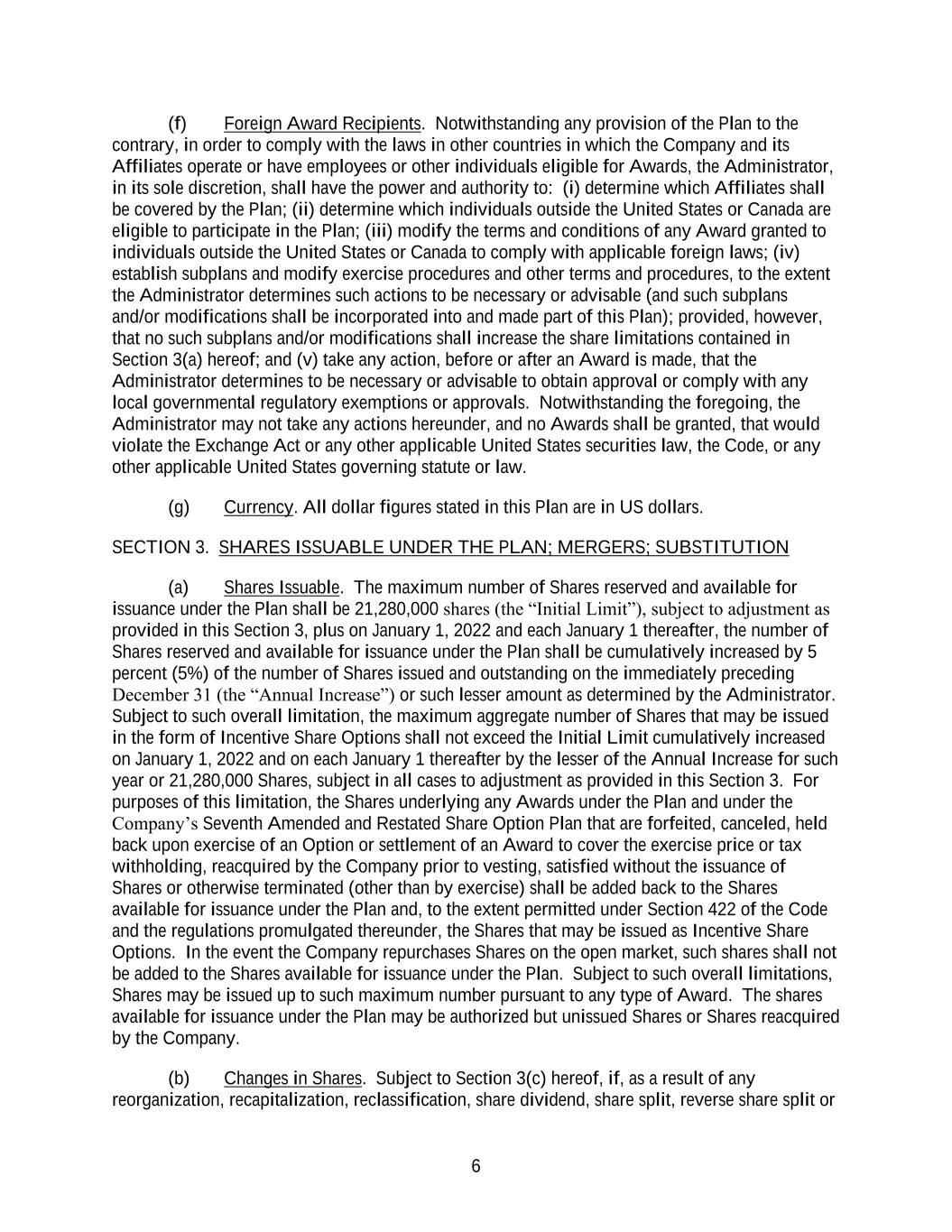 6 (f) Foreign Award Recipients. Notwithstanding any provision of the Plan to the contrary, in order to comply with the laws in other countries in which the Company and its Affiliates operate or have employees or other individuals eligible for Awards, the Administrator, in its sole discretion, shall have the power and authority to: (i) determine which Affiliates shall be covered by the Plan; (ii) determine which individuals outside the United States or Canada are eligible to participate in the Plan; (iii) modify the terms and conditions of any Award granted to individuals outside the United States or Canada to comply with applicable foreign laws; (iv) establish subplans and modify exercise procedures and other terms and procedures, to the extent the Administrator determines such actions to be necessary or advisable (and such subplans and/or modifications shall be incorporated into and made part of this Plan); provided, however, that no such subplans and/or modifications shall increase the share limitations contained in Section 3(a) hereof; and (v) take any action, before or after an Award is made, that the Administrator determines to be necessary or advisable to obtain approval or comply with any local governmental regulatory exemptions or approvals. Notwithstanding the foregoing, the Administrator may not take any actions hereunder, and no Awards shall be granted, that would violate the Exchange Act or any other applicable United States securities law, the Code, or any other applicable United States governing statute or law. (g) Currency. All dollar figures stated in this Plan are in US dollars. SECTION 3. SHARES ISSUABLE UNDER THE PLAN; MERGERS; SUBSTITUTION (a) Shares Issuable. The maximum number of Shares reserved and available for issuance under the Plan shall be 21,280,000 shares (the “Initial Limit”), subject to adjustment as provided in this Section 3, plus on January 1, 2022 and each January 1 thereafter, the number of Shares reserved and available for issuance under the Plan shall be cumulatively increased by 5 percent (5%) of the number of Shares issued and outstanding on the immediately preceding December 31 (the “Annual Increase”) or such lesser amount as determined by the Administrator. Subject to such overall limitation, the maximum aggregate number of Shares that may be issued in the form of Incentive Share Options shall not exceed the Initial Limit cumulatively increased on January 1, 2022 and on each January 1 thereafter by the lesser of the Annual Increase for such year or 21,280,000 Shares, subject in all cases to adjustment as provided in this Section 3. For purposes of this limitation, the Shares underlying any Awards under the Plan and under the Company’s Seventh Amended and Restated Share Option Plan that are forfeited, canceled, held back upon exercise of an Option or settlement of an Award to cover the exercise price or tax withholding, reacquired by the Company prior to vesting, satisfied without the issuance of Shares or otherwise terminated (other than by exercise) shall be added back to the Shares available for issuance under the Plan and, to the extent permitted under Section 422 of the Code and the regulations promulgated thereunder, the Shares that may be issued as Incentive Share Options. In the event the Company repurchases Shares on the open market, such shares shall not be added to the Shares available for issuance under the Plan. Subject to such overall limitations, Shares may be issued up to such maximum number pursuant to any type of Award. The shares available for issuance under the Plan may be authorized but unissued Shares or Shares reacquired by the Company. (b) Changes in Shares. Subject to Section 3(c) hereof, if, as a result of any reorganization, recapitalization, reclassification, share dividend, share split, reverse share split or