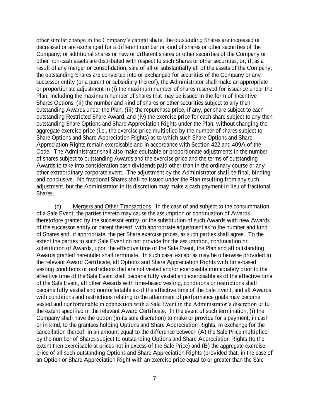 7 other similar change in the Company’s capital share, the outstanding Shares are increased or decreased or are exchanged for a different number or kind of shares or other securities of the Company, or additional shares or new or different shares or other securities of the Company or other non-cash assets are distributed with respect to such Shares or other securities, or, if, as a result of any merger or consolidation, sale of all or substantially all of the assets of the Company, the outstanding Shares are converted into or exchanged for securities of the Company or any successor entity (or a parent or subsidiary thereof), the Administrator shall make an appropriate or proportionate adjustment in (i) the maximum number of shares reserved for issuance under the Plan, including the maximum number of shares that may be issued in the form of Incentive Shares Options, (ii) the number and kind of shares or other securities subject to any then outstanding Awards under the Plan, (iii) the repurchase price, if any, per share subject to each outstanding Restricted Share Award, and (iv) the exercise price for each share subject to any then outstanding Share Options and Share Appreciation Rights under the Plan, without changing the aggregate exercise price (i.e., the exercise price multiplied by the number of shares subject to Share Options and Share Appreciation Rights) as to which such Share Options and Share Appreciation Rights remain exercisable and in accordance with Section 422 and 409A of the Code. The Administrator shall also make equitable or proportionate adjustments in the number of shares subject to outstanding Awards and the exercise price and the terms of outstanding Awards to take into consideration cash dividends paid other than in the ordinary course or any other extraordinary corporate event. The adjustment by the Administrator shall be final, binding and conclusive. No fractional Shares shall be issued under the Plan resulting from any such adjustment, but the Administrator in its discretion may make a cash payment in lieu of fractional Shares. (c) Mergers and Other Transactions. In the case of and subject to the consummation of a Sale Event, the parties thereto may cause the assumption or continuation of Awards theretofore granted by the successor entity, or the substitution of such Awards with new Awards of the successor entity or parent thereof, with appropriate adjustment as to the number and kind of Shares and, if appropriate, the per Share exercise prices, as such parties shall agree. To the extent the parties to such Sale Event do not provide for the assumption, continuation or substitution of Awards, upon the effective time of the Sale Event, the Plan and all outstanding Awards granted hereunder shall terminate. In such case, except as may be otherwise provided in the relevant Award Certificate, all Options and Share Appreciation Rights with time-based vesting conditions or restrictions that are not vested and/or exercisable immediately prior to the effective time of the Sale Event shall become fully vested and exercisable as of the effective time of the Sale Event, all other Awards with time-based vesting, conditions or restrictions shall become fully vested and nonforfeitable as of the effective time of the Sale Event, and all Awards with conditions and restrictions relating to the attainment of performance goals may become vested and nonforfeitable in connection with a Sale Event in the Administrator’s discretion or to the extent specified in the relevant Award Certificate. In the event of such termination, (i) the Company shall have the option (in its sole discretion) to make or provide for a payment, in cash or in kind, to the grantees holding Options and Share Appreciation Rights, in exchange for the cancellation thereof, in an amount equal to the difference between (A) the Sale Price multiplied by the number of Shares subject to outstanding Options and Share Appreciation Rights (to the extent then exercisable at prices not in excess of the Sale Price) and (B) the aggregate exercise price of all such outstanding Options and Share Appreciation Rights (provided that, in the case of an Option or Share Appreciation Right with an exercise price equal to or greater than the Sale